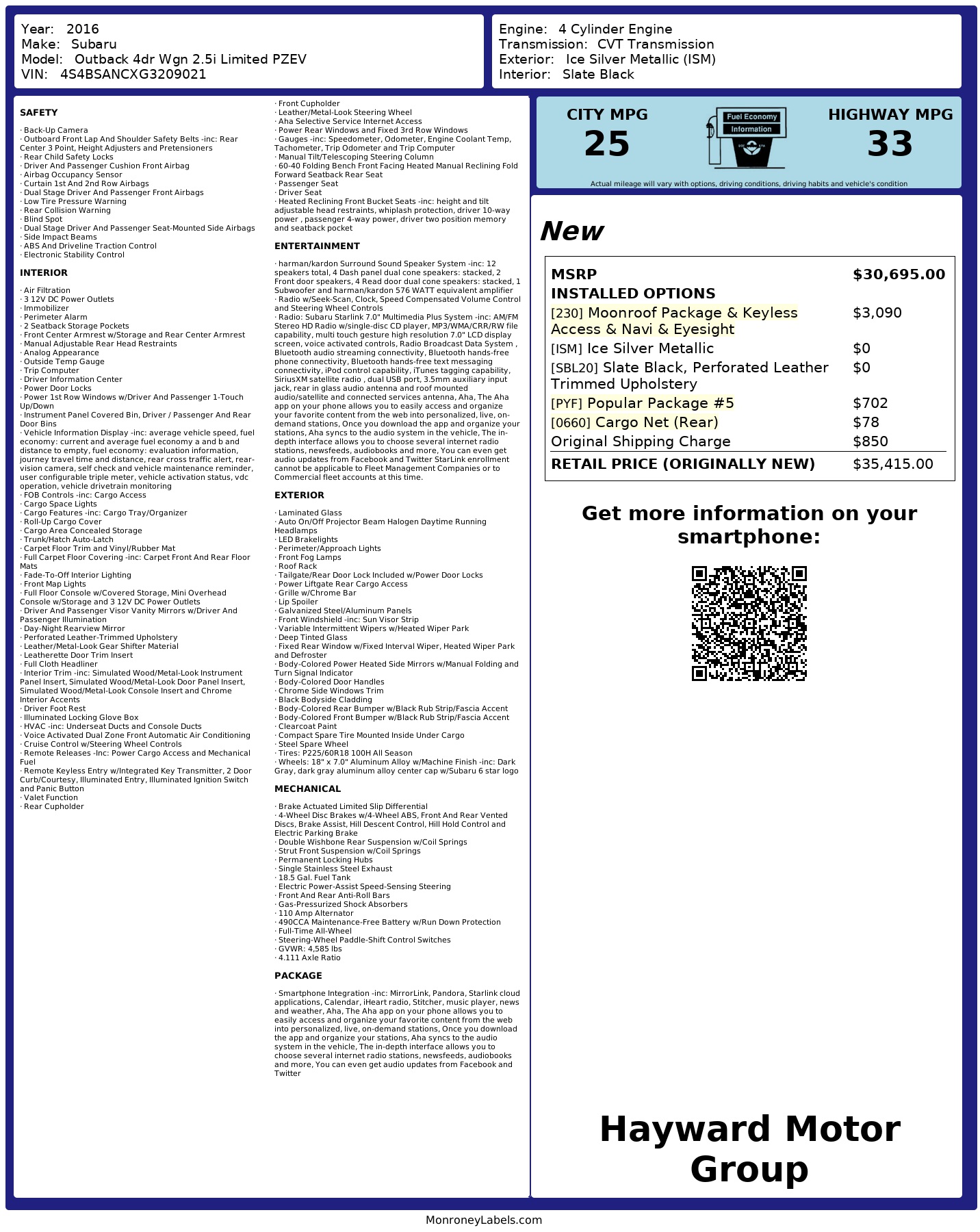 2016 Subaru Outback 4dr Wgn 2.5i Limited Pzev