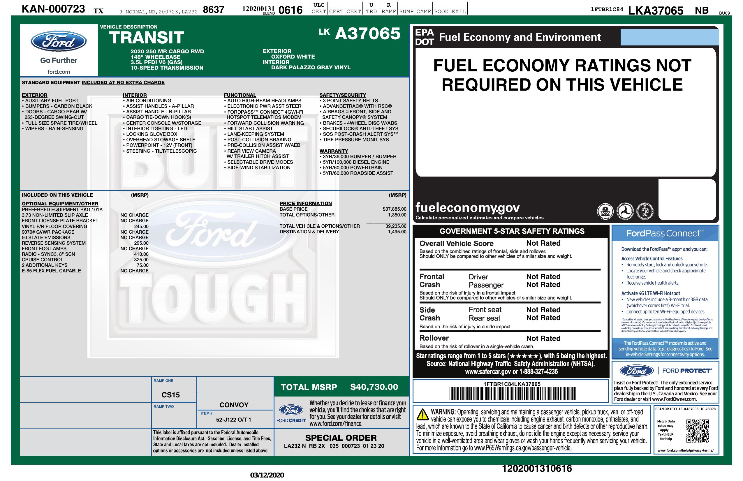 2020 Ford Transit Cargo Van T 250 Med Rf 9070 Gvwr Rwd