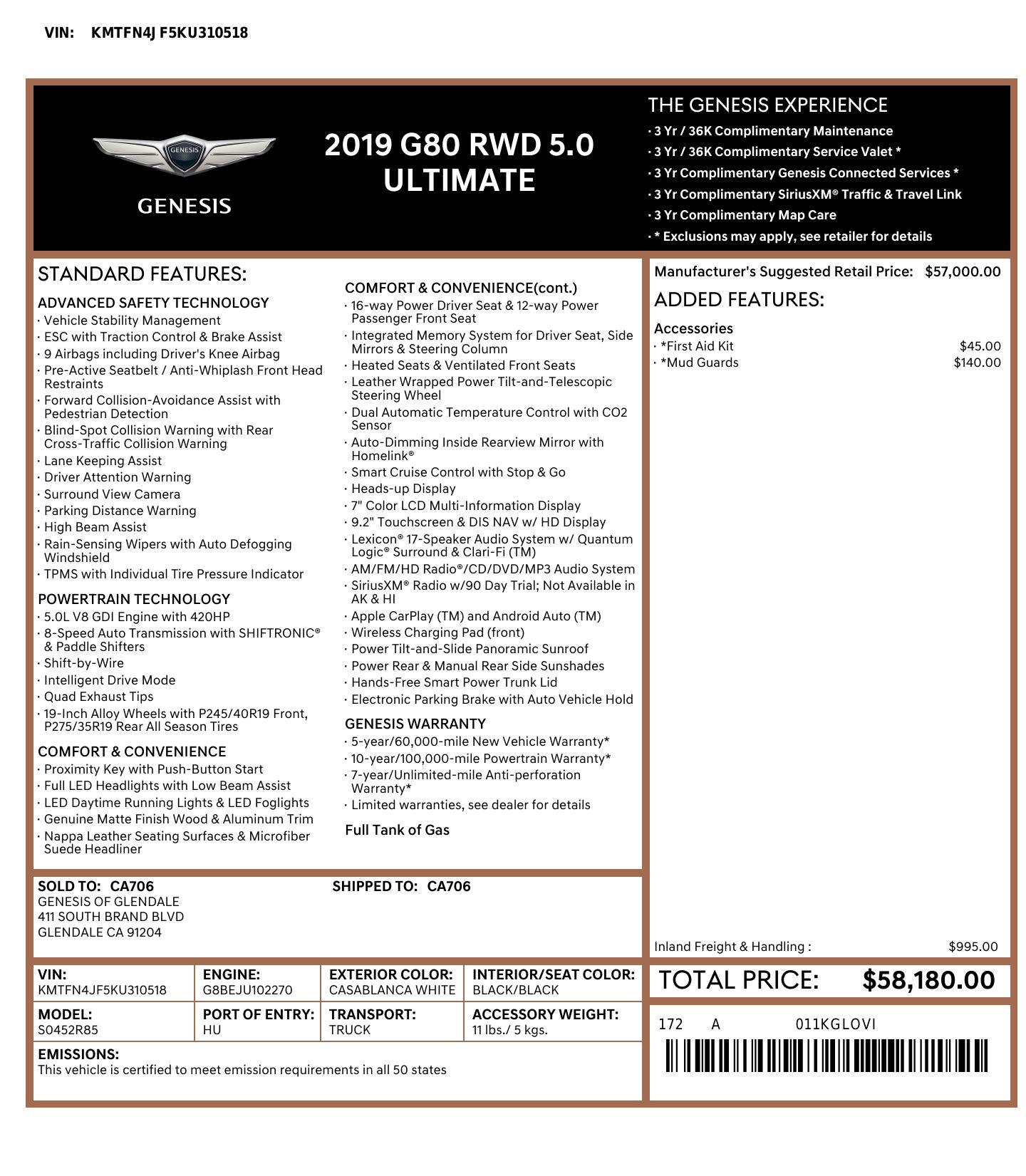 2019 Genesis G80 5.0 Ultimate 4dr Sedan