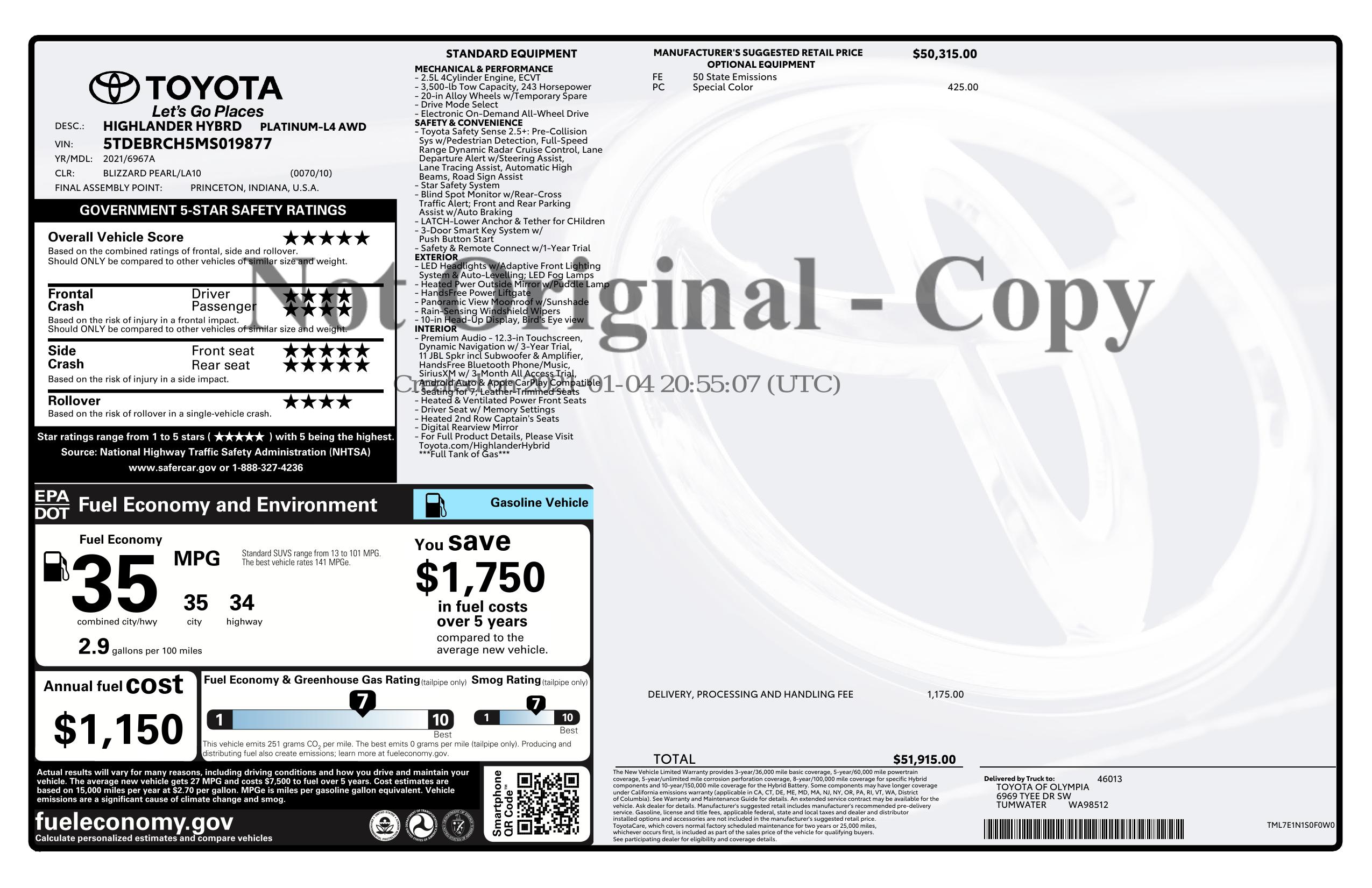 2021 Toyota Highlander Hybrid Platinum Awd (Natl)