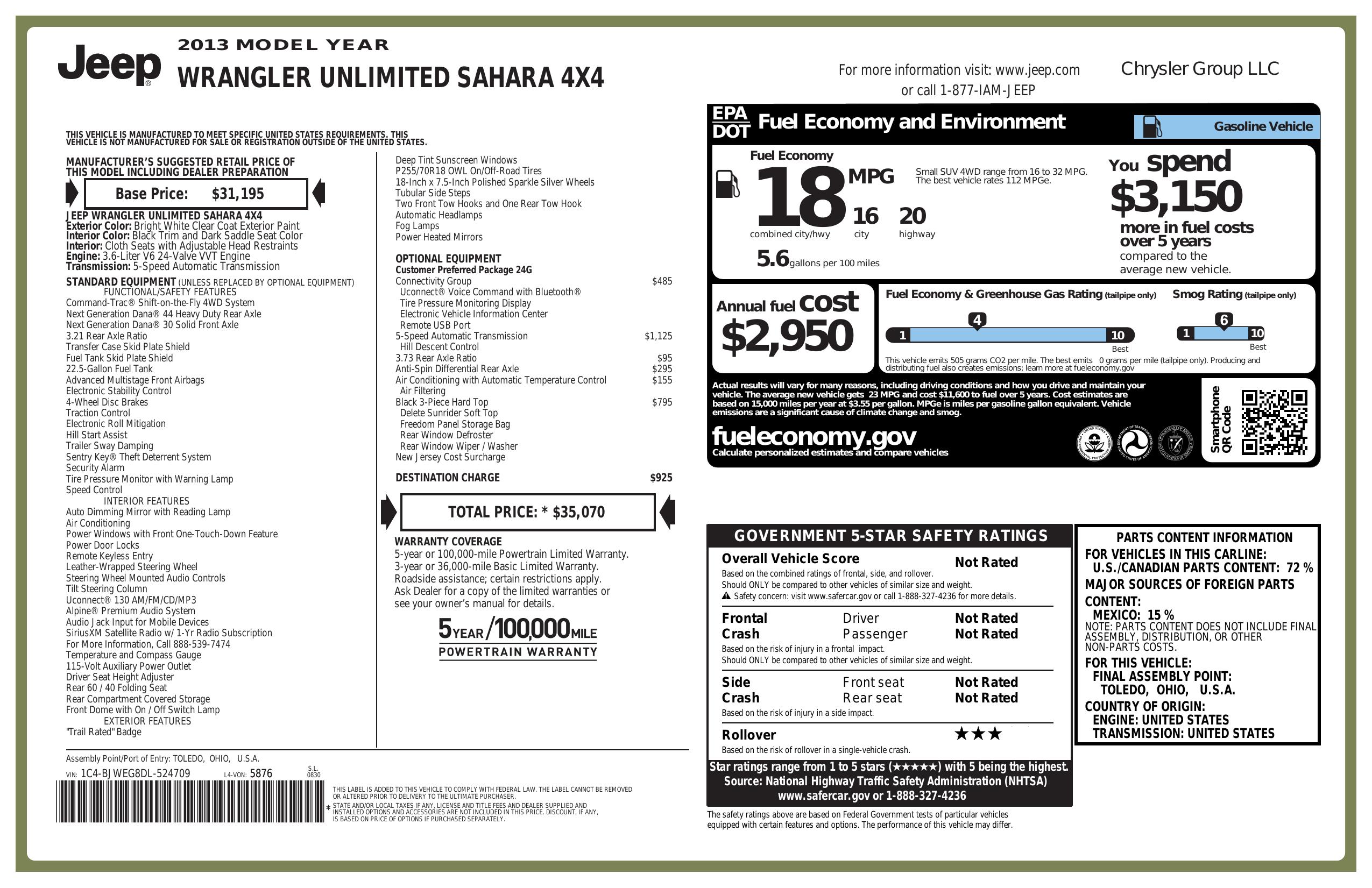 2013 Jeep Wrangler Unlimited 4 Wd 4dr Sahara