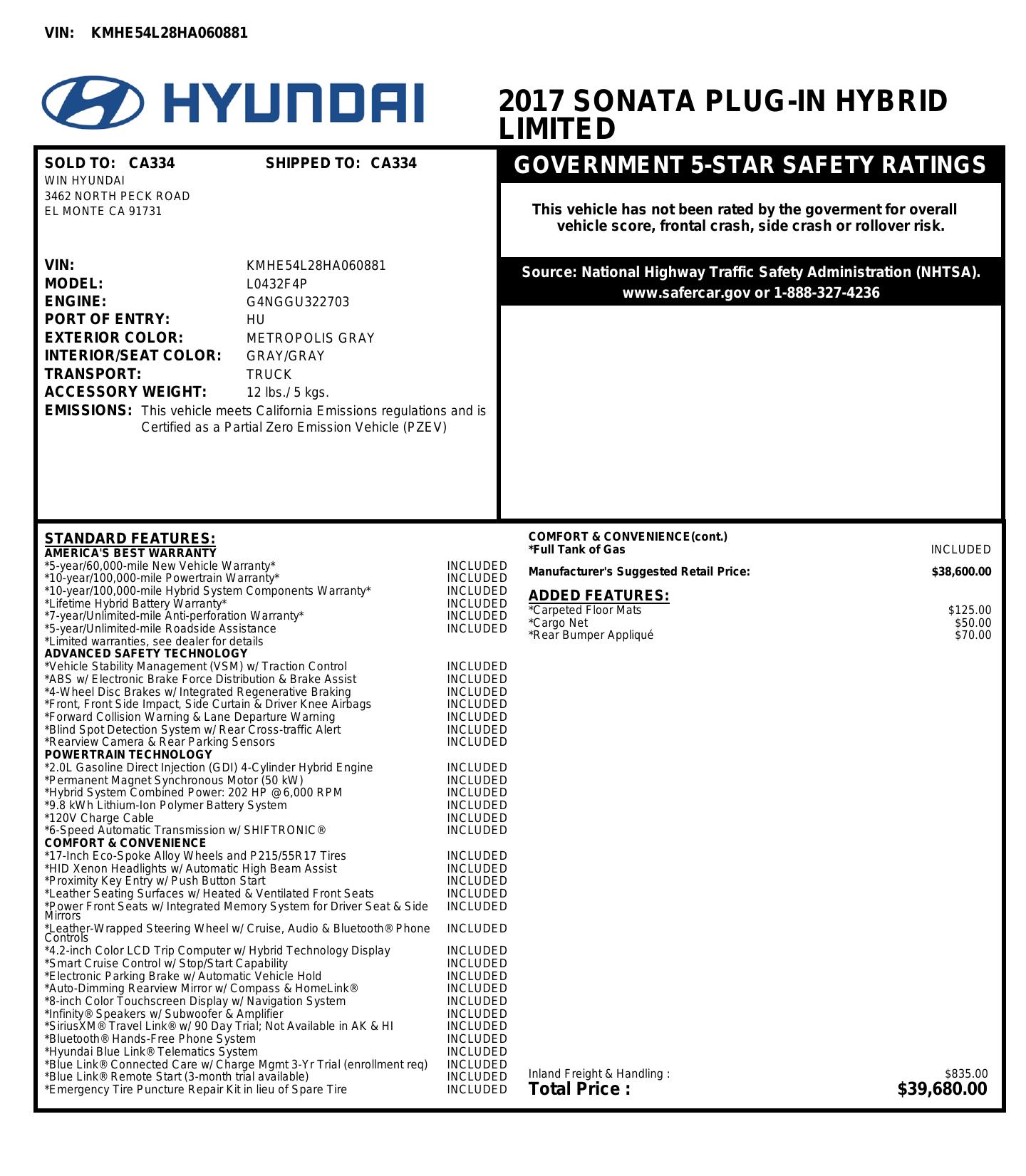 2017 Hyundai Sonata Plug In Hybrid Limited 2.0 L