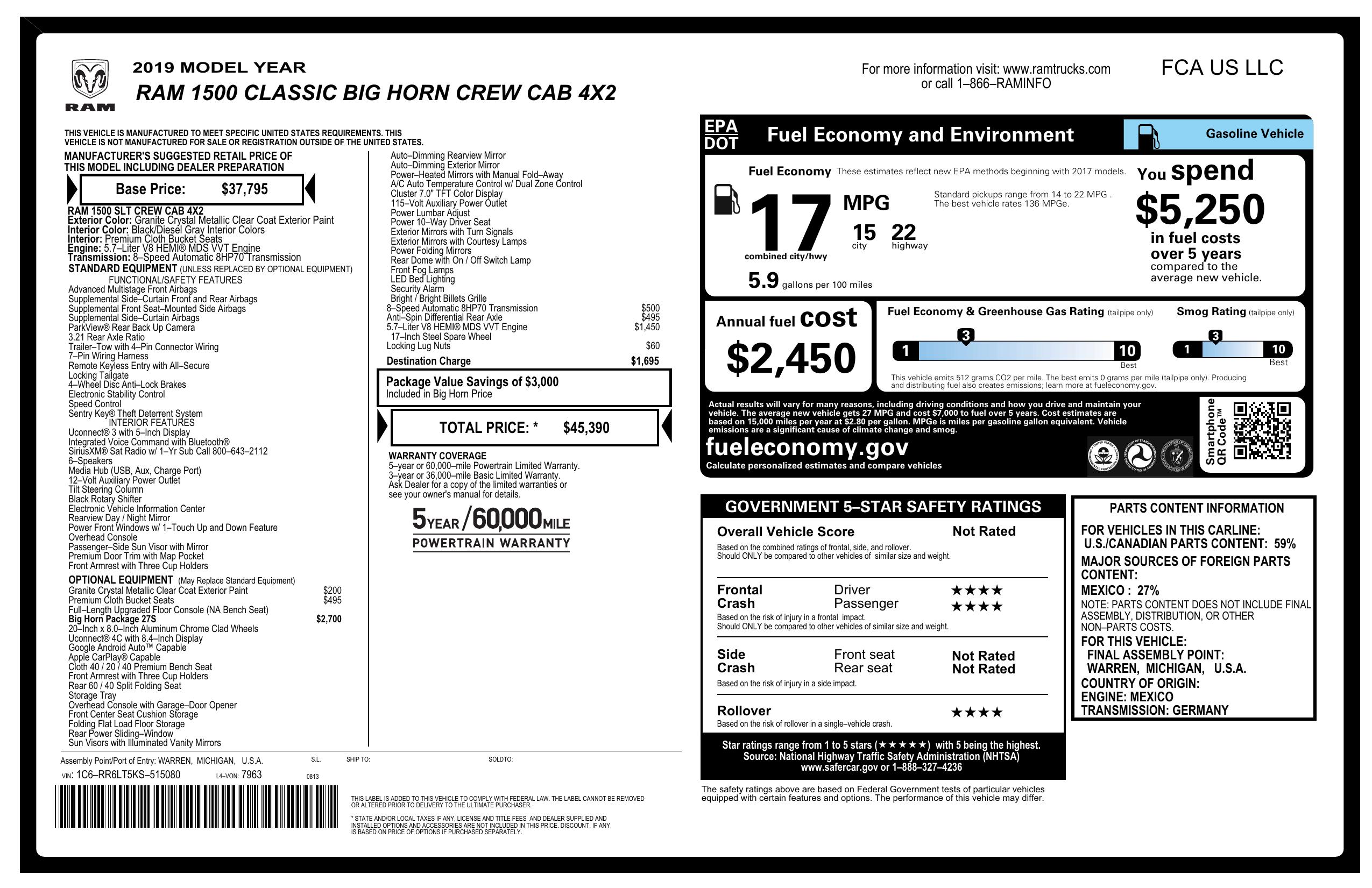 2019 Ram 1500 Classic Big Horn 4x2 Crew Cab 5'7" Box