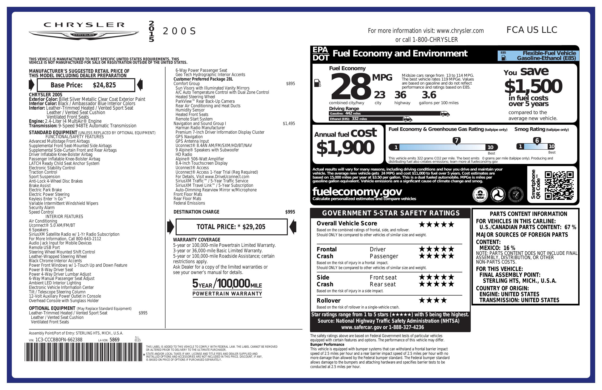2015 Chrysler 200 4dr Sdn S Fwd