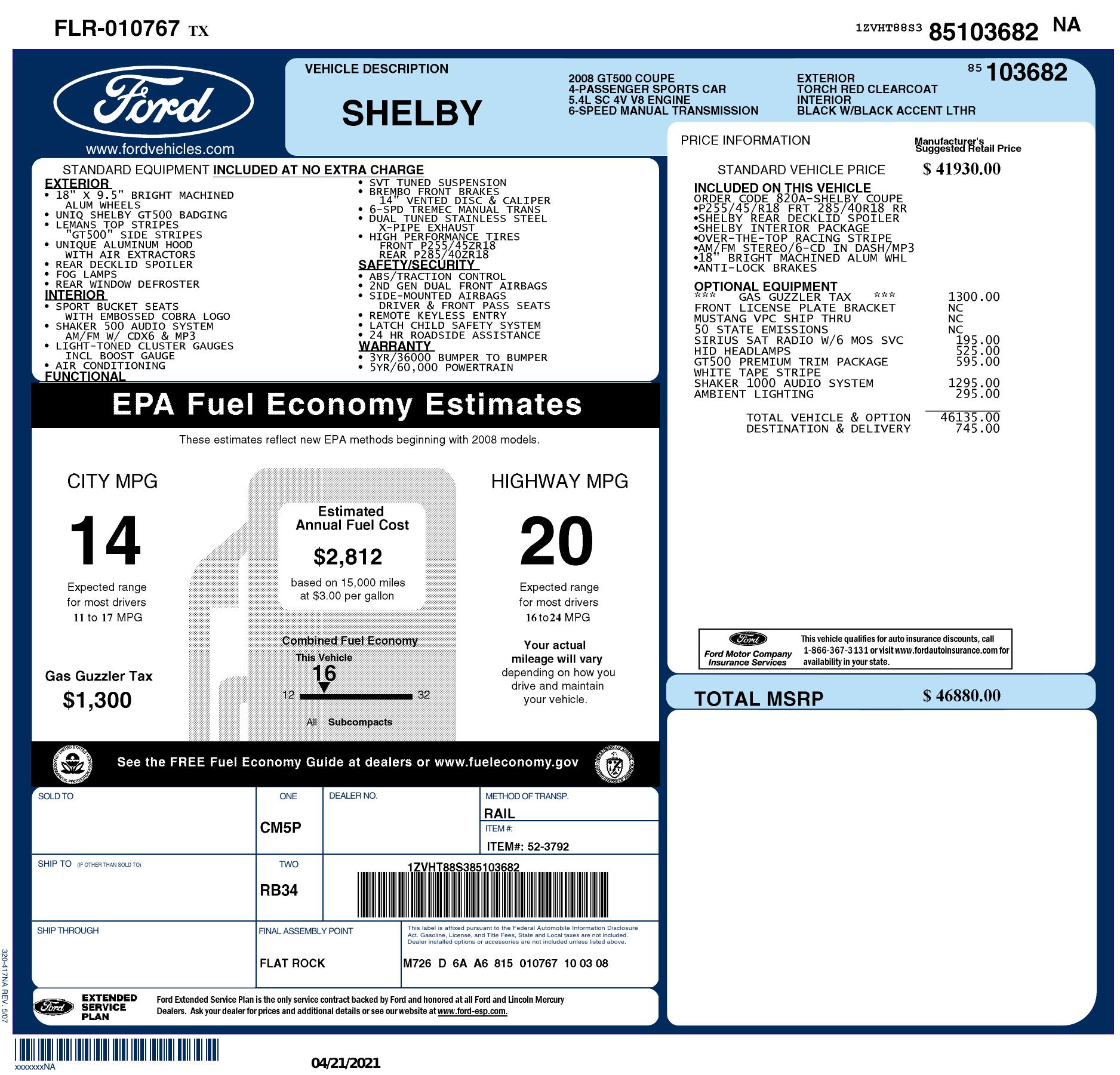 2008 Ford Mustang 2dr Cpe Shelby Gt500