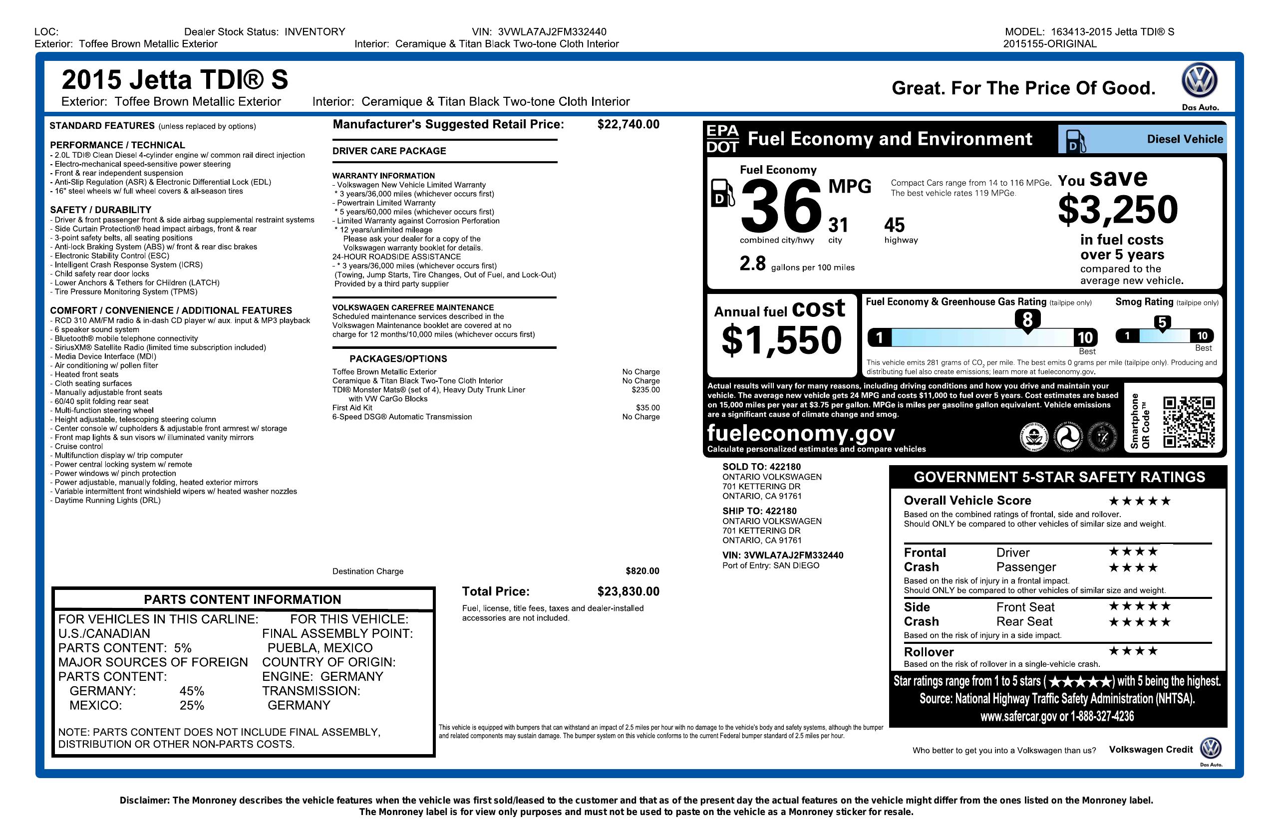 2015 Volkswagen Jetta Sedan 4dr Dsg 2.0 L Tdi S