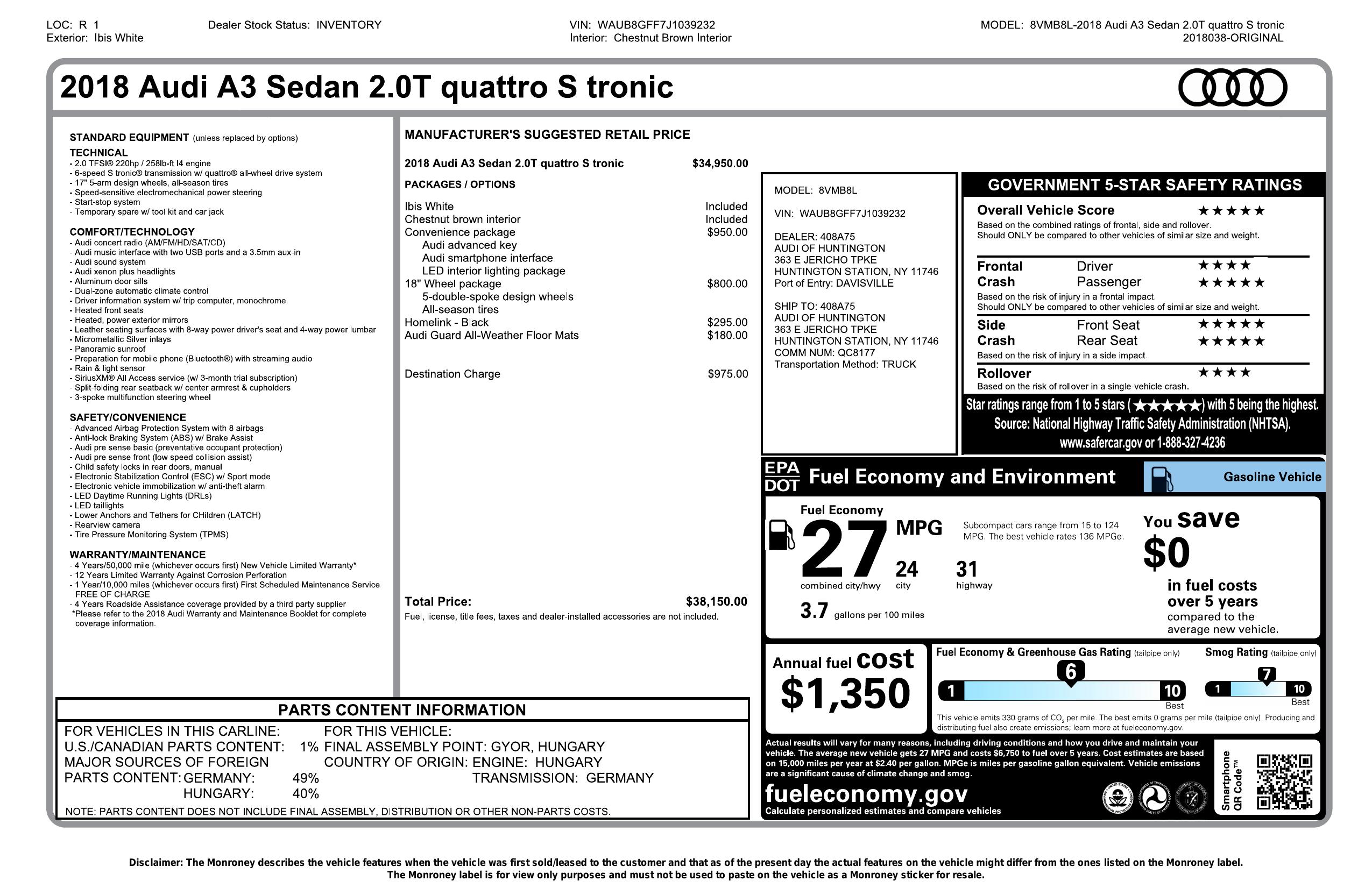 2018 Audi A3 Sedan 2.0 Tfsi Premium Quattro Awd