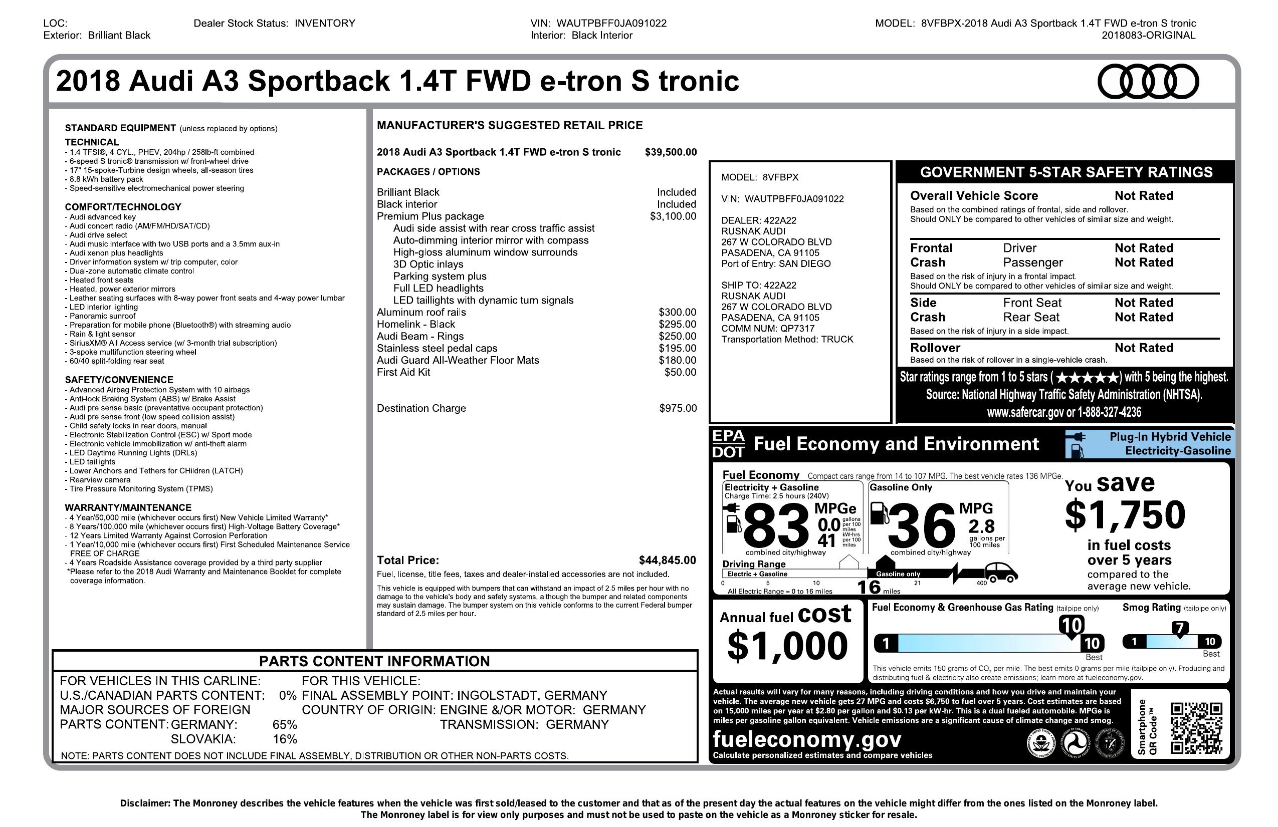 2018 Audi A3 Sportback E Tron 1.4 Tfsi Phev Premium Plus