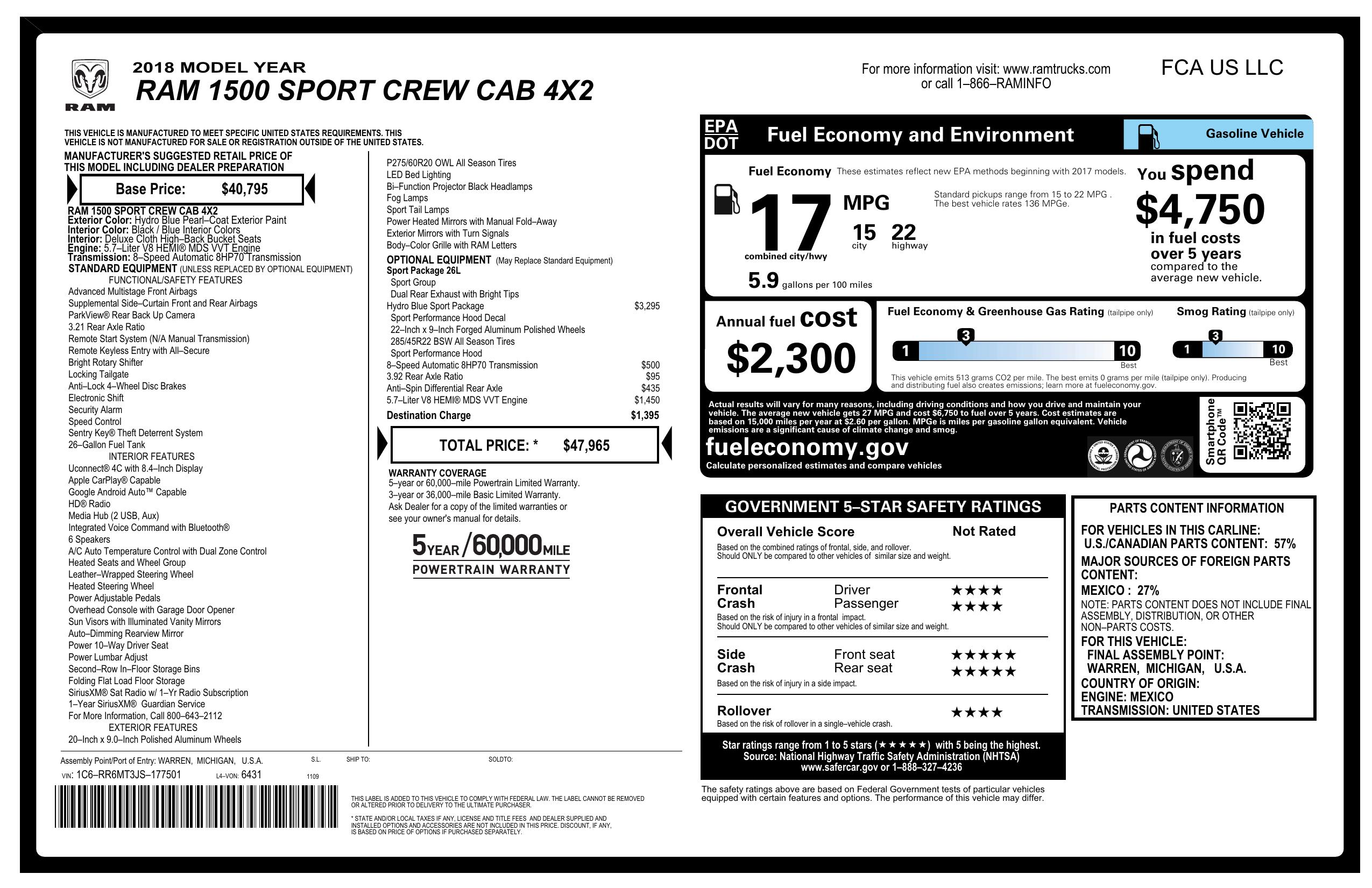 2018 Ram 1500 Sport 4x2 Crew Cab 5'7" Box *Ltd Avail*