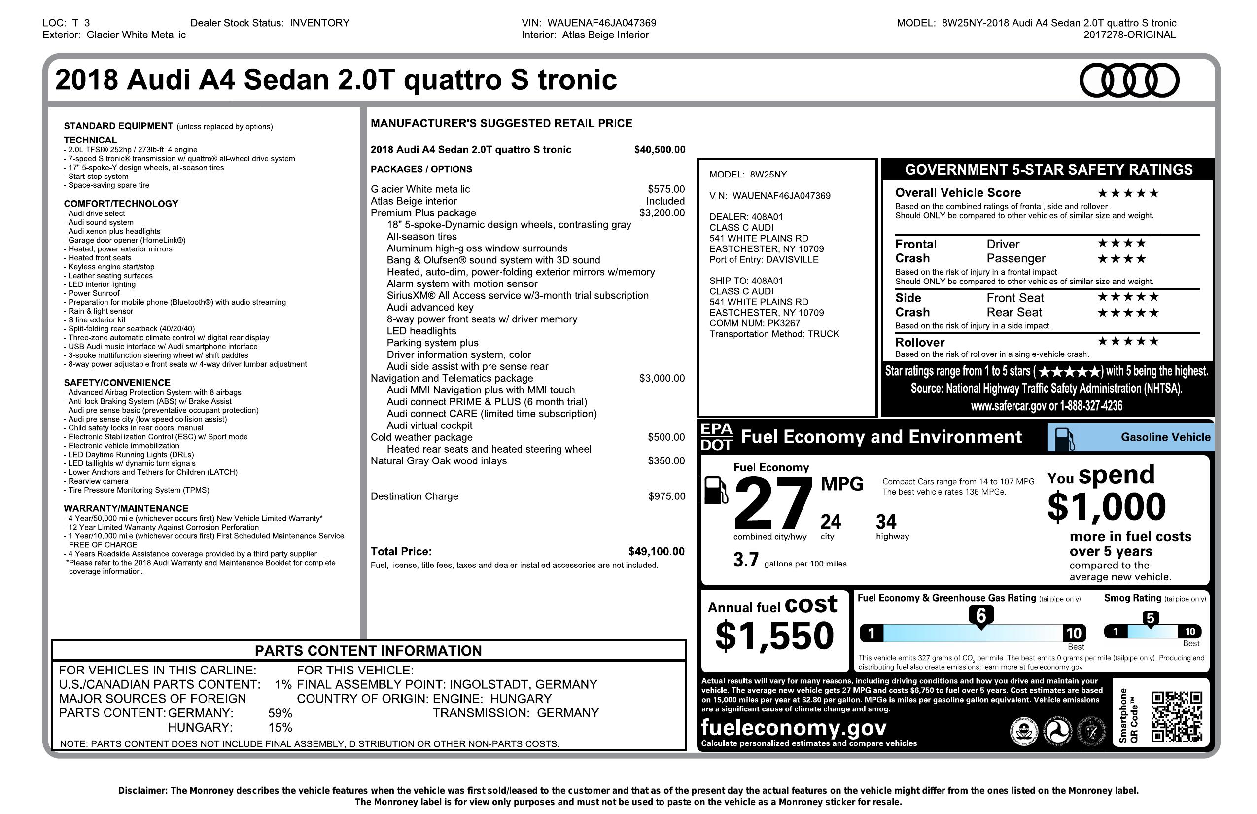 2018 Audi A4 2.0 Tfsi Premium Plus S Tronic Quattro Awd