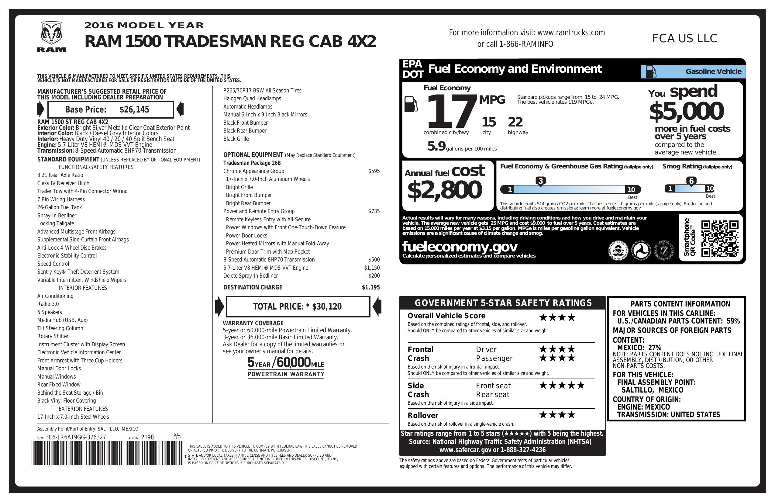 2016 Ram 1500 2 Wd Reg Cab 120.5" Tradesman