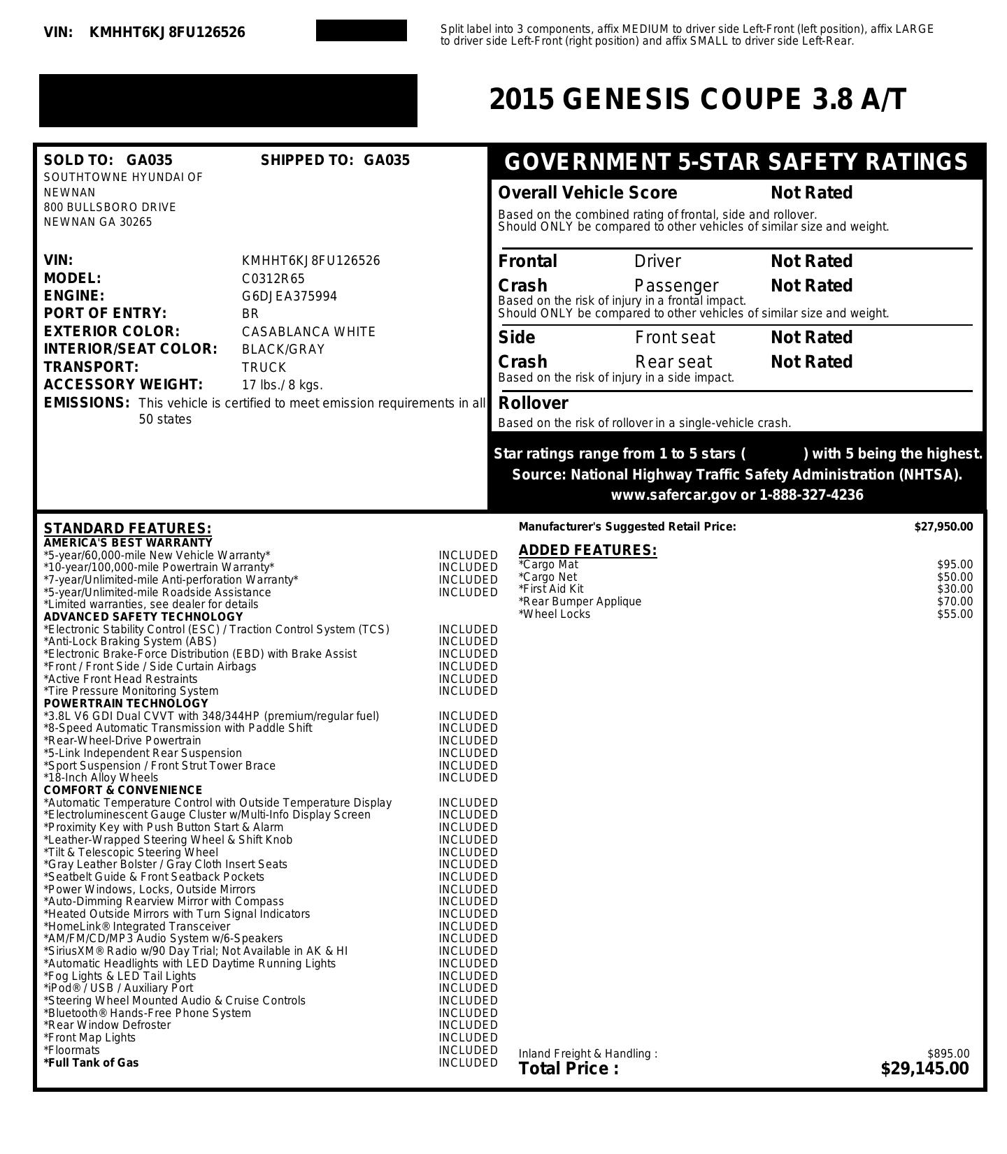 2015 Hyundai Genesis Coupe 2dr 3.8 L Auto Base W/Gray Seats