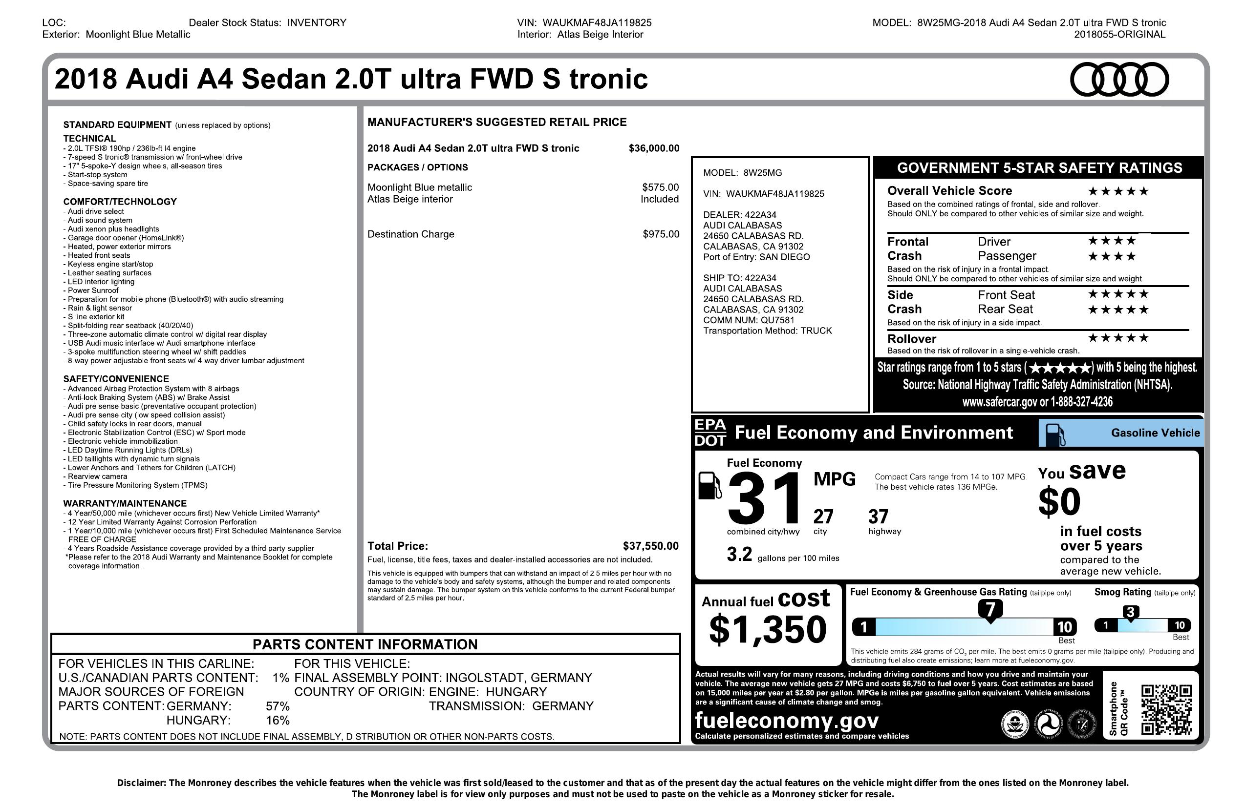 2018 Audi A4 2.0 Tfsi Ultra Premium S Tronic Fwd