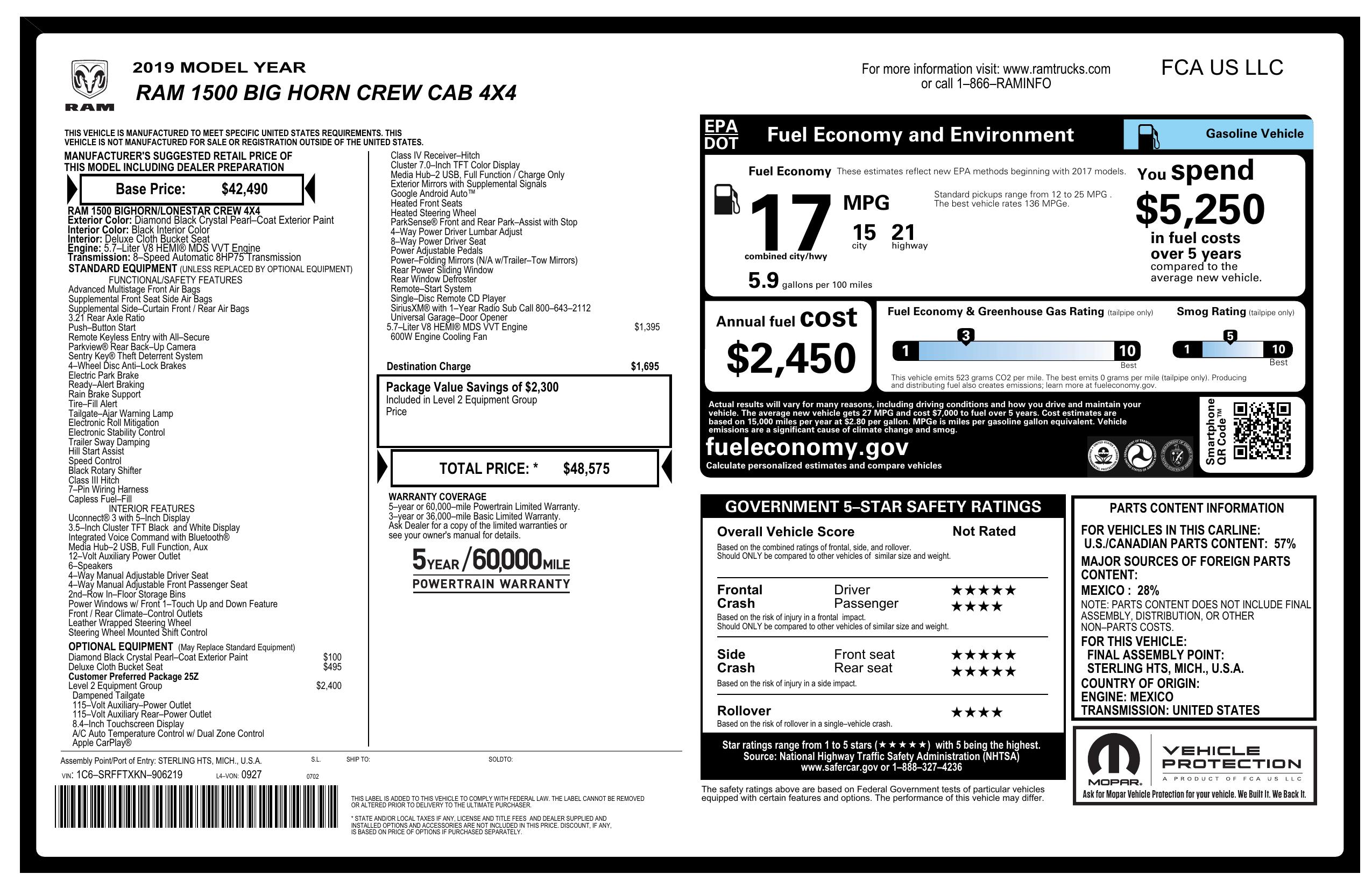 2019 Ram 1500 Big Horn/Lone Star 4x4 Crew Cab 5'7" Box