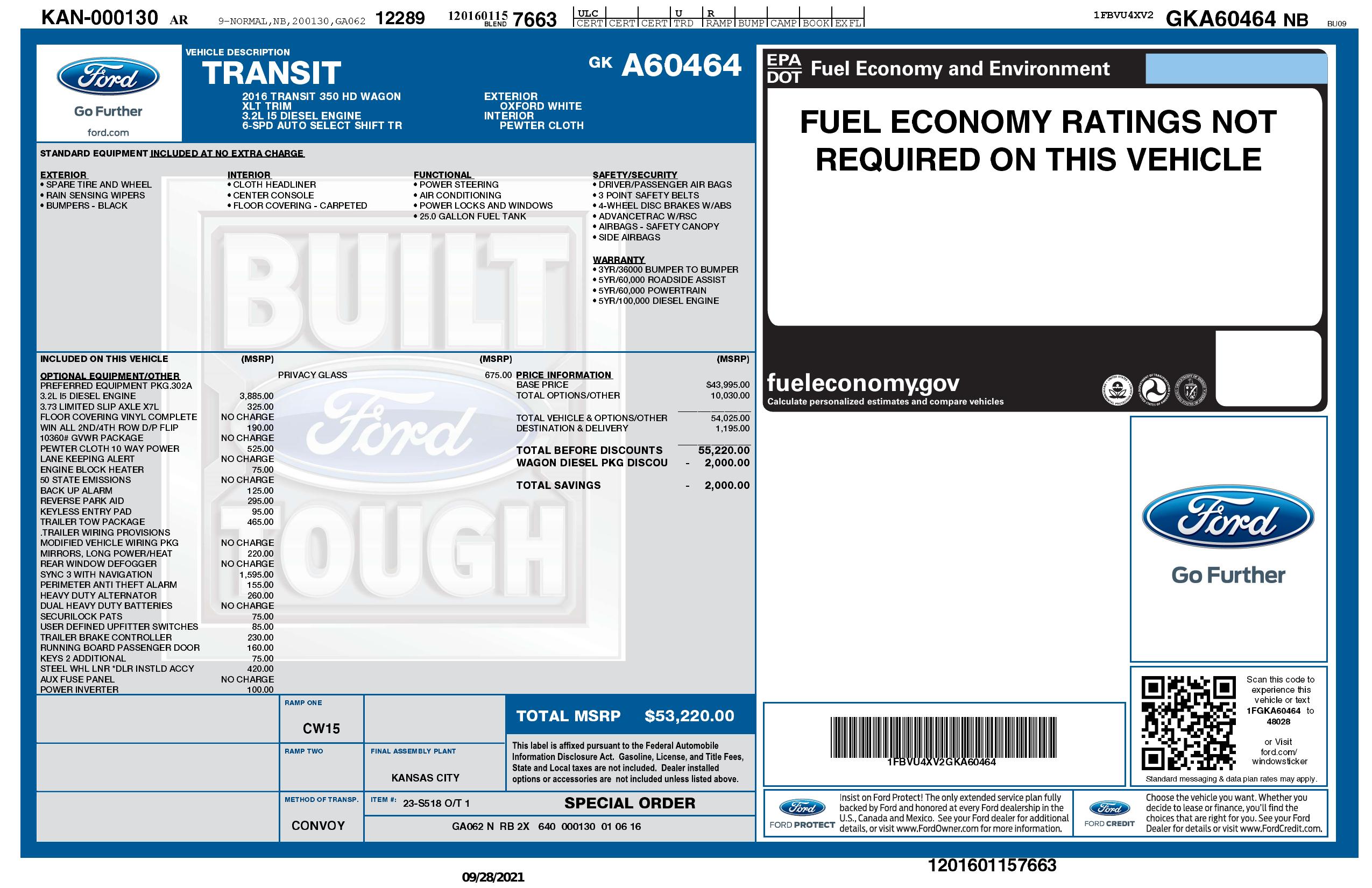 2016 Ford Transit Wagon T 350 148" El High Roof Sliding Rh Dr Drw