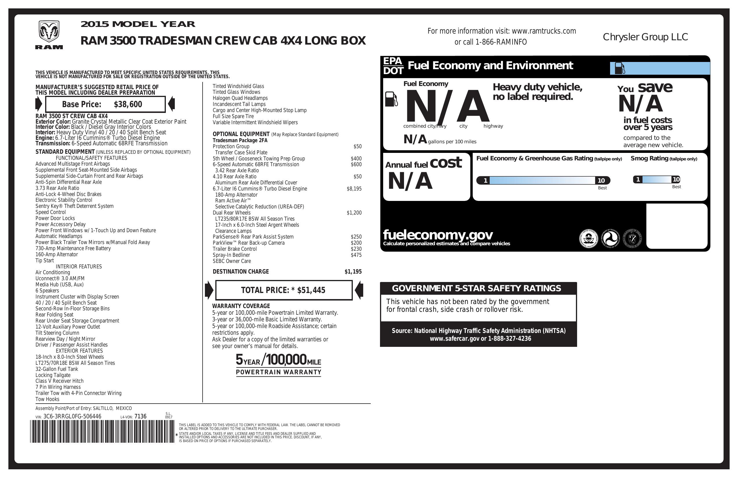 2015 Ram 3500 4 Wd Crew Cab 169" Tradesman
