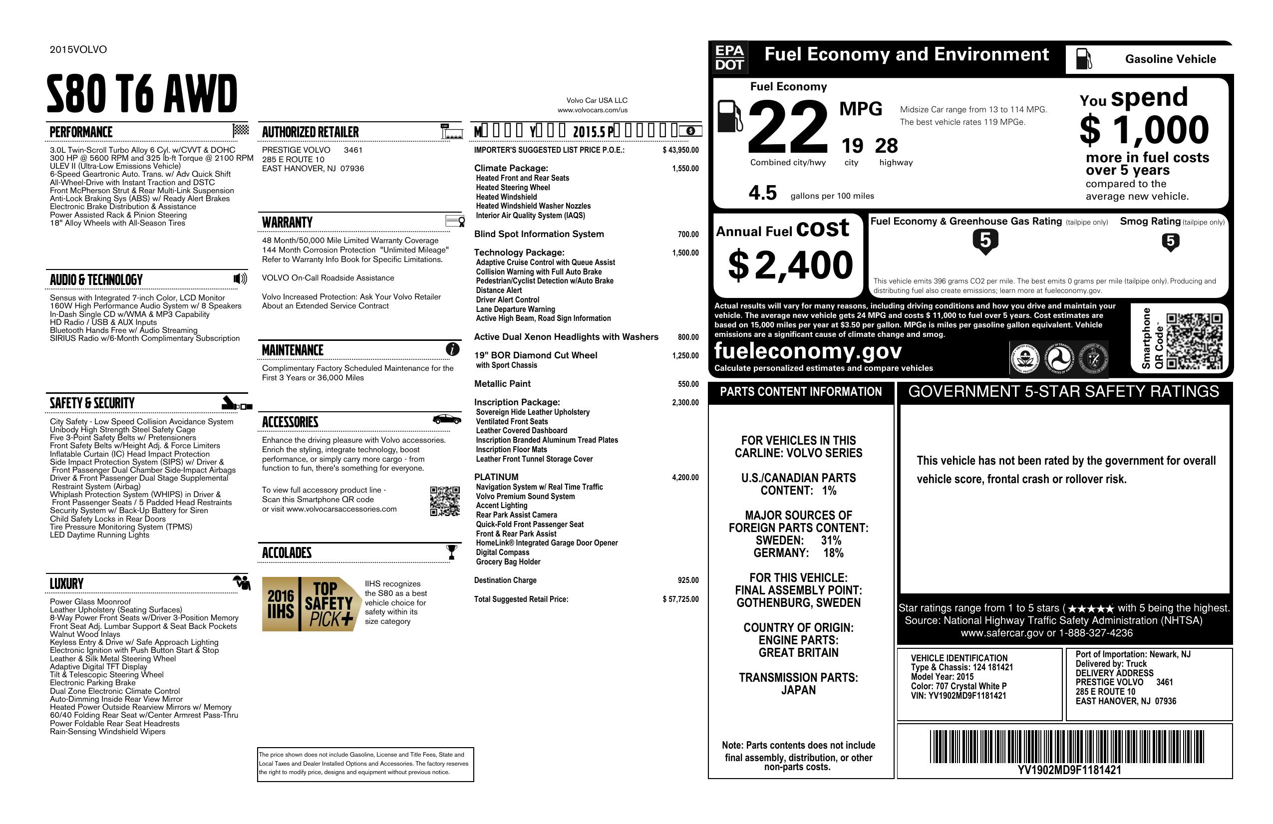 2015 Volvo S80 4dr Sdn T6 Platinum Awd