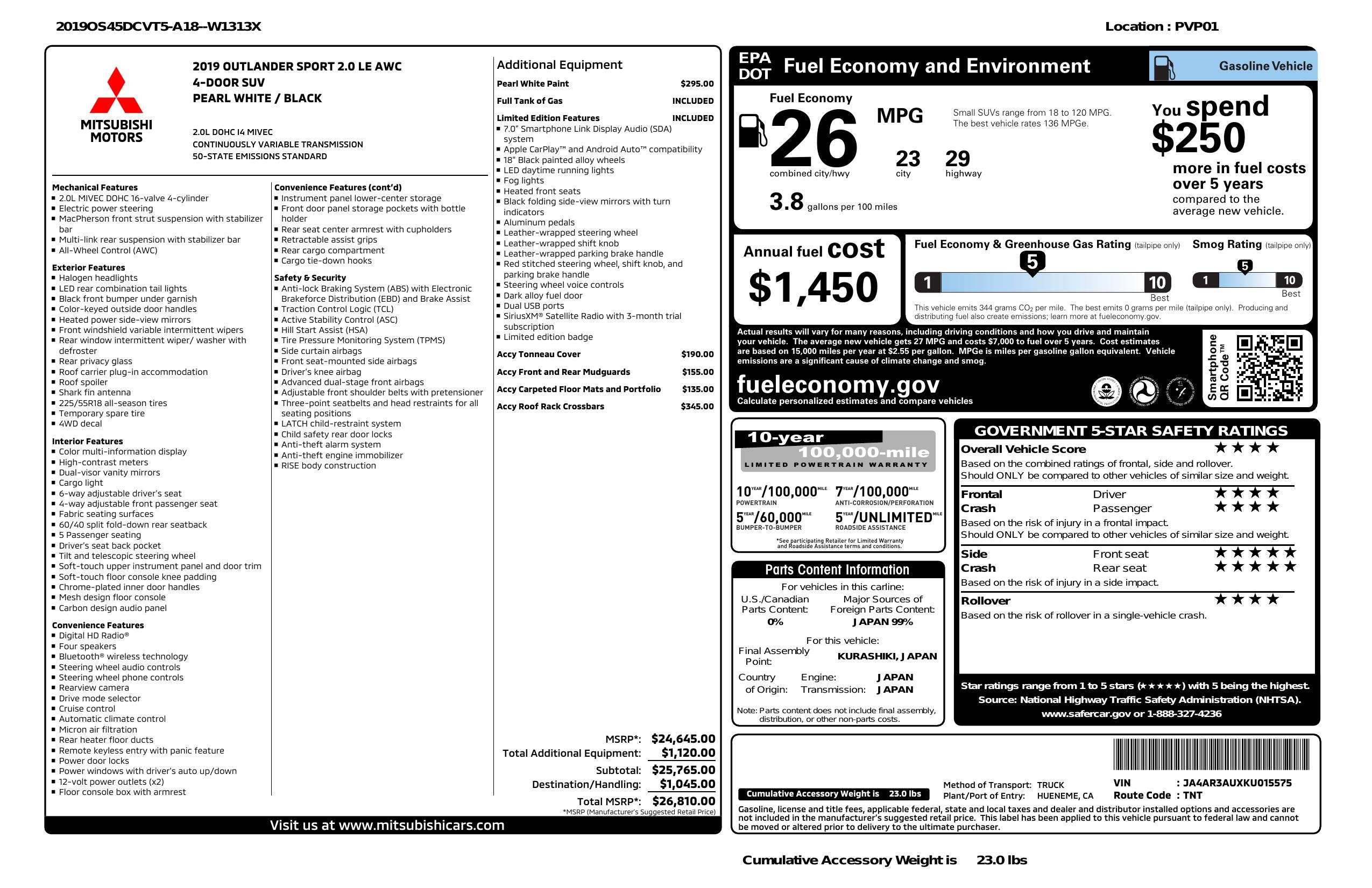 2019 Mitsubishi Outlander Sport 2.0 Awc Cvt