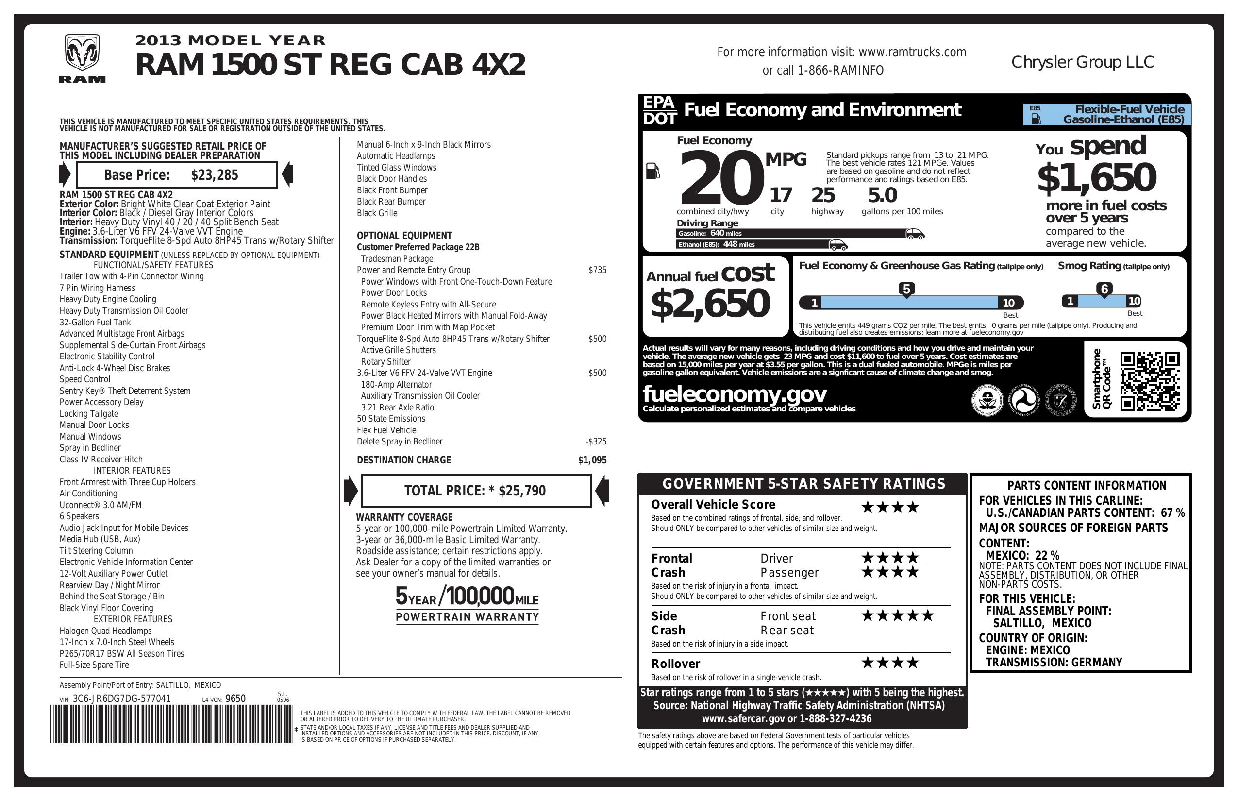 2013 Ram 1500 2 Wd Reg Cab 140.5" Tradesman