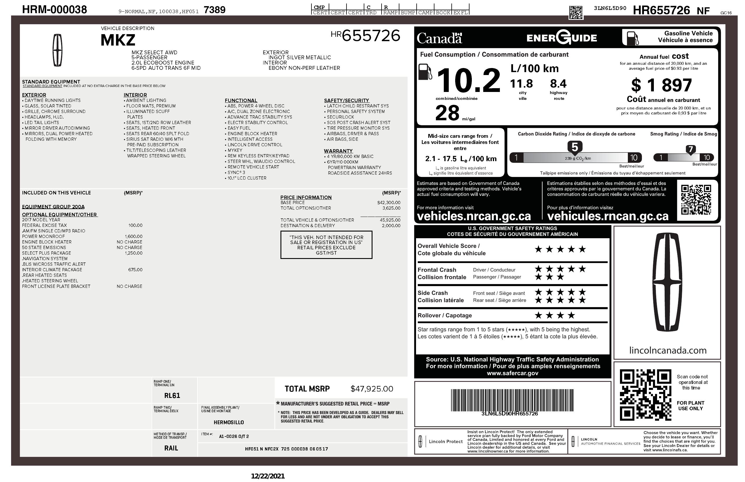 2017 Lincoln Mkz Select Awd