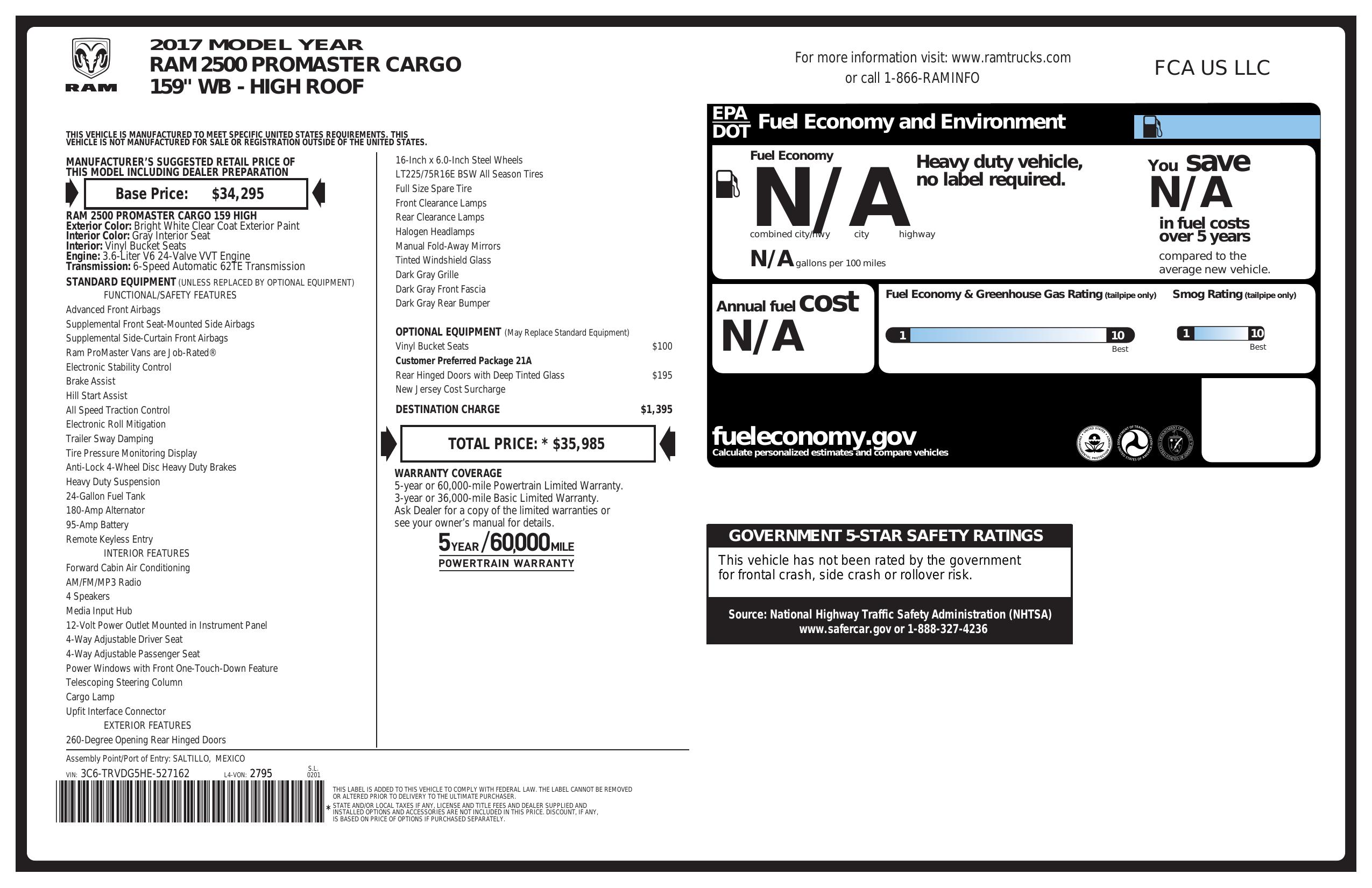 2017 Ram Pro Master Cargo Van 2500 High Roof 159" Wb