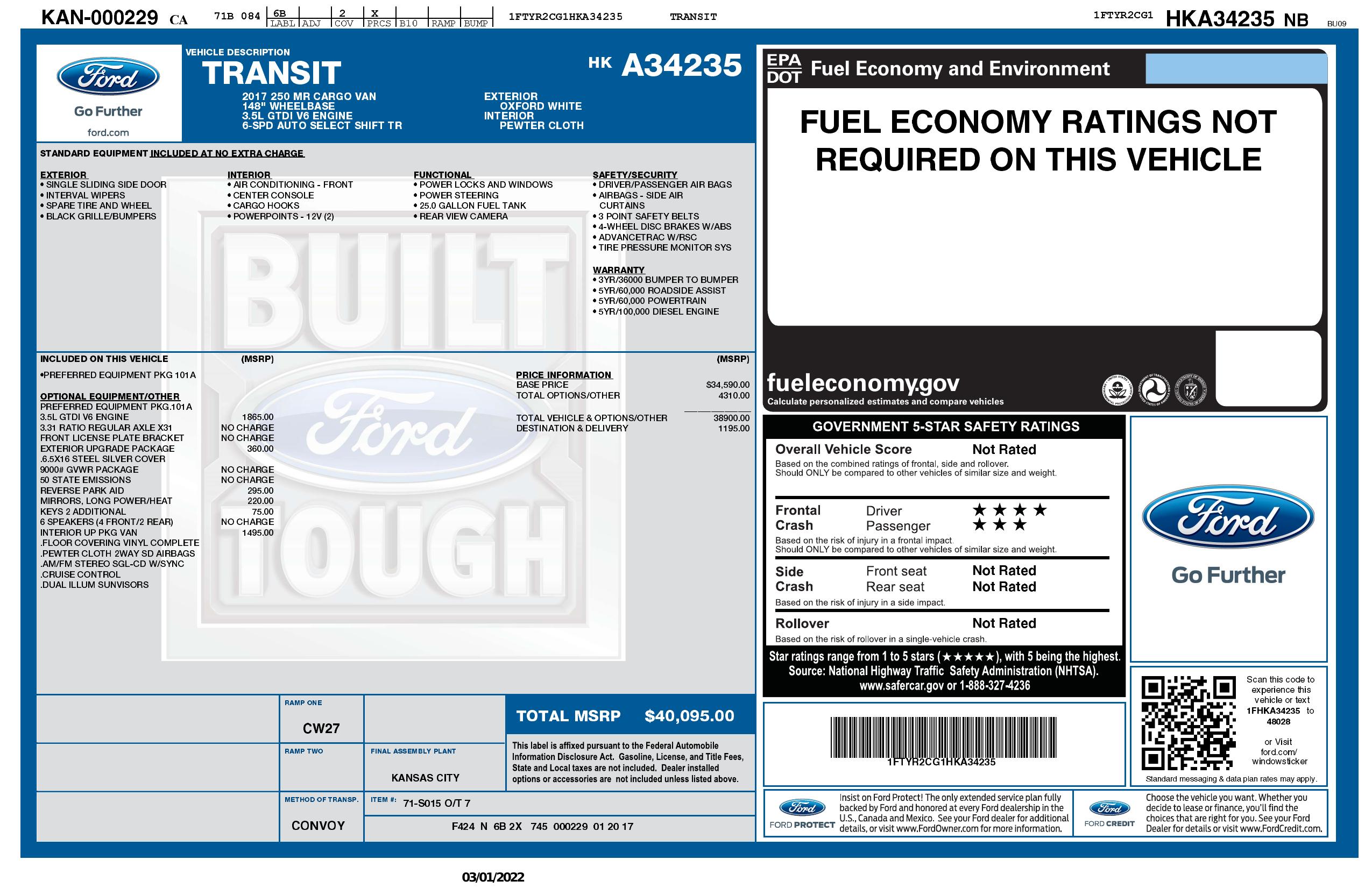 2017 Ford Transit Van T 250 148" Med Rf 9000 Gvwr Sliding Rh Dr