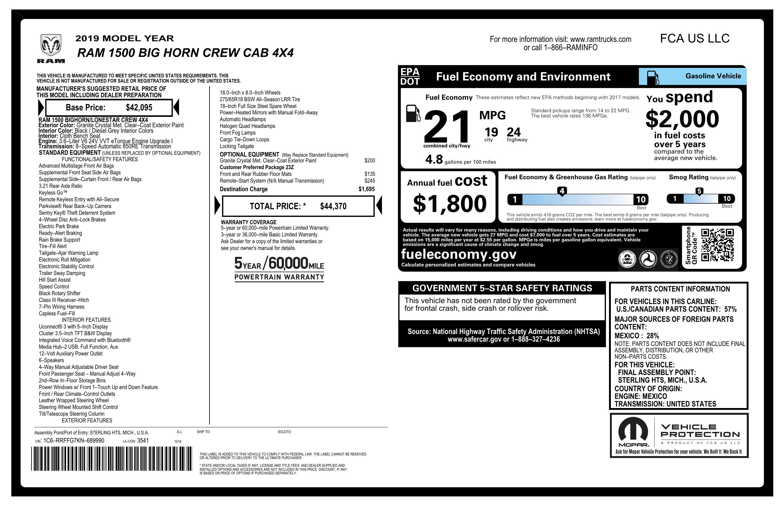 2019 Ram 1500 Big Horn/Lone Star 4x4 Crew Cab 5'7" Box