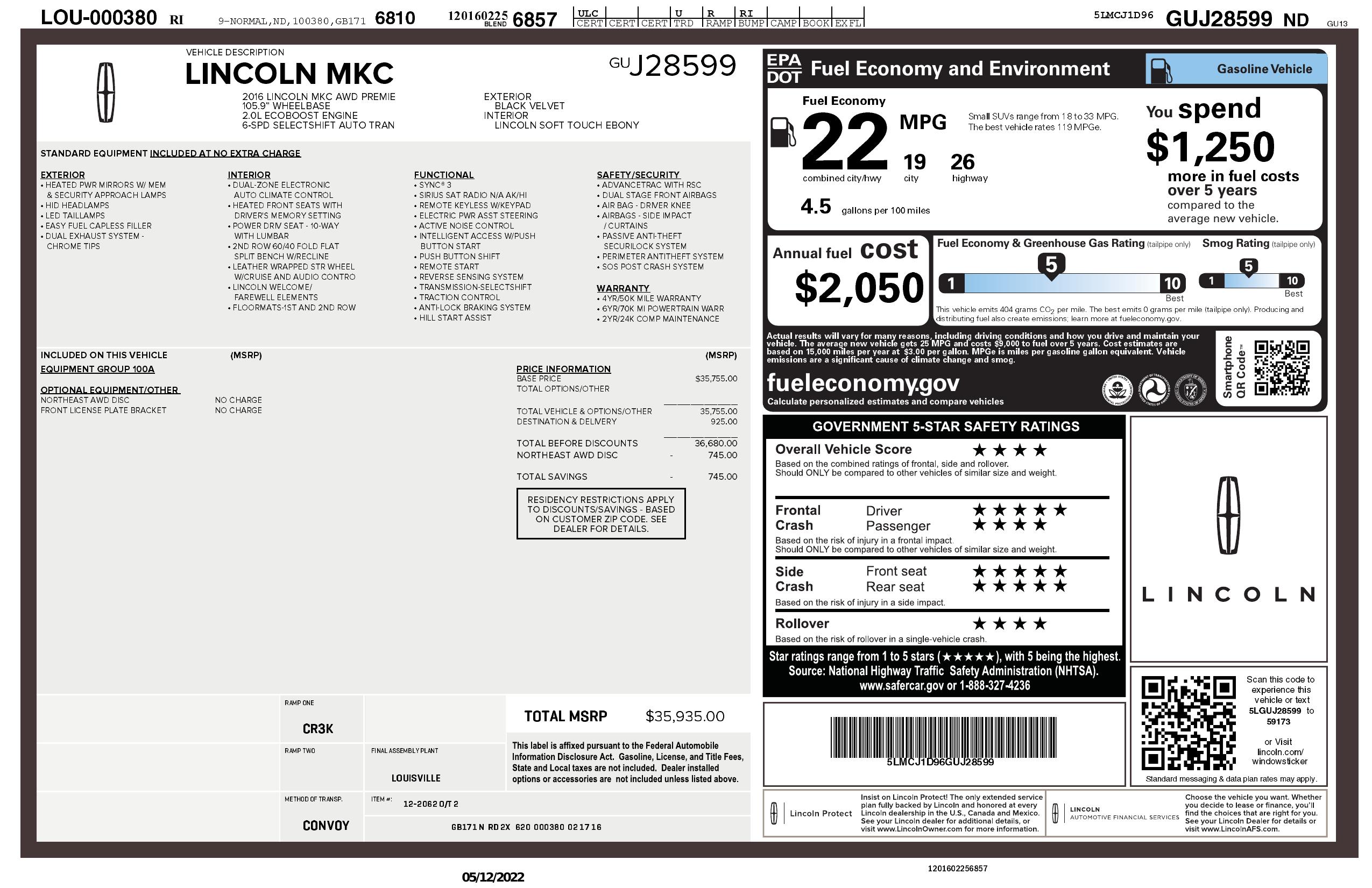 2016 Lincoln Mkc Awd 4dr Premier