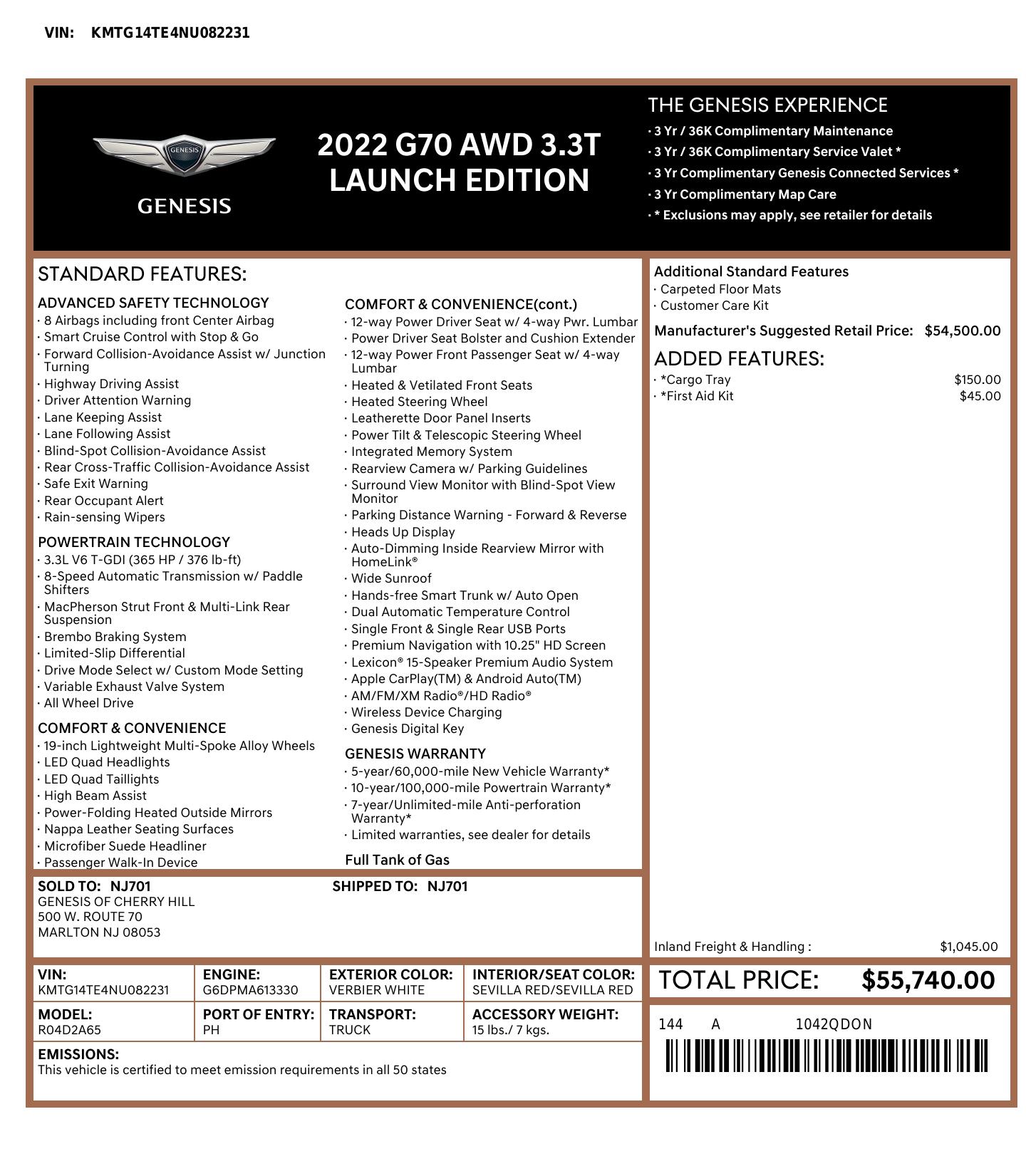 2022 Genesis G70 3.3 T Launch Edition Awd