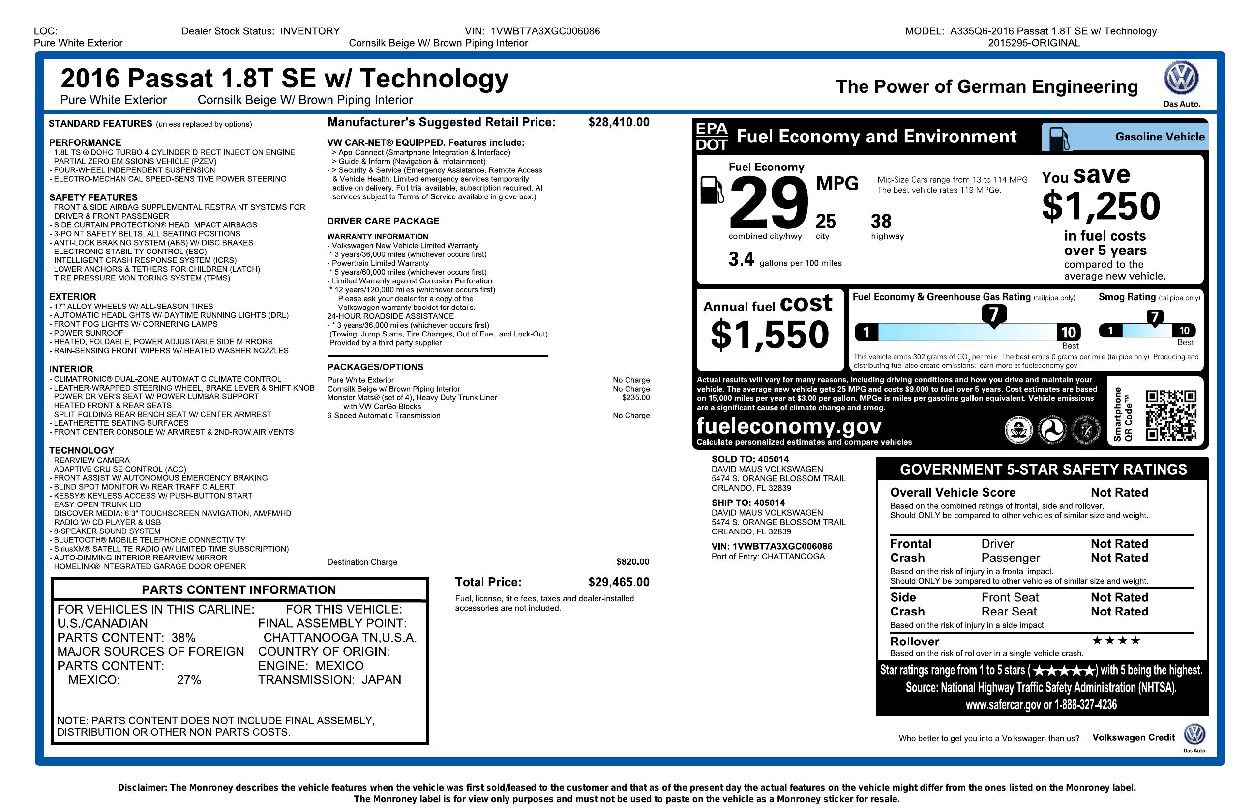 2016 Volkswagen Passat 4dr Sdn 1.8 T Auto Se W/Technology Pzev