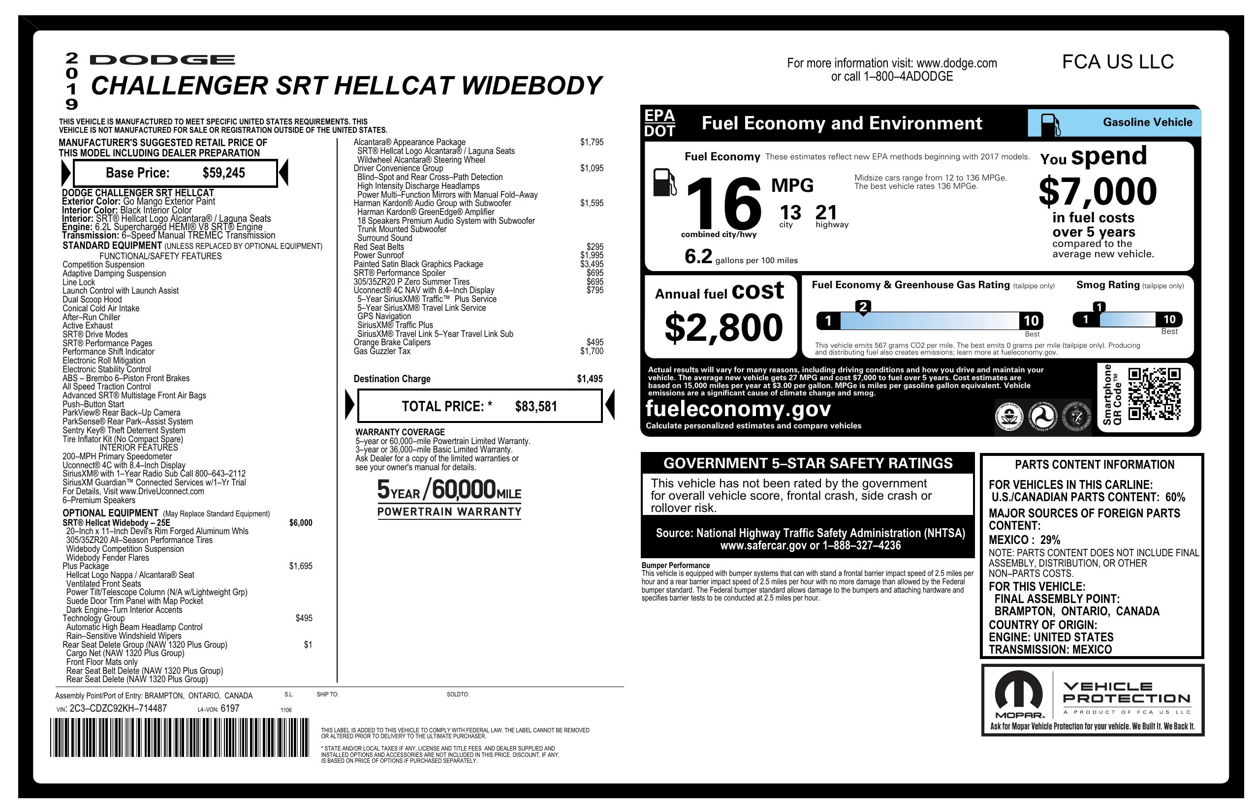 2019 Dodge Challenger Srt Hellcat Widebody Rwd