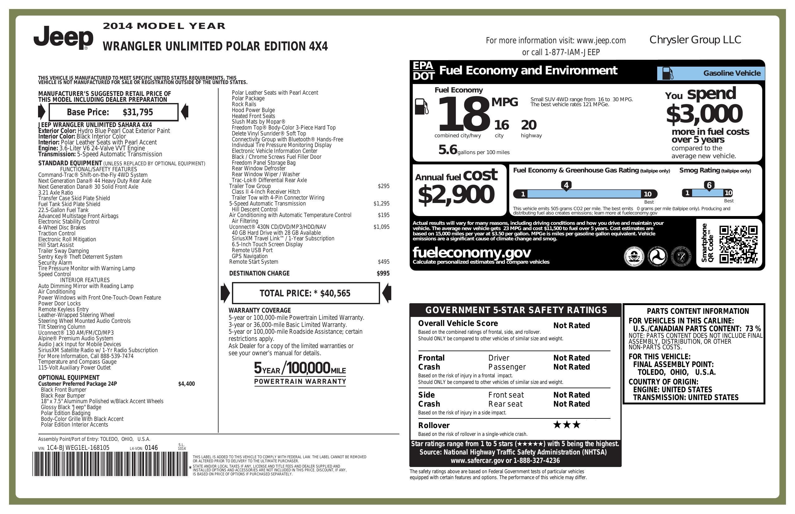 2014 Jeep Wrangler Unlimited 4 Wd 4dr Polar Edition *Ltd Avail*
