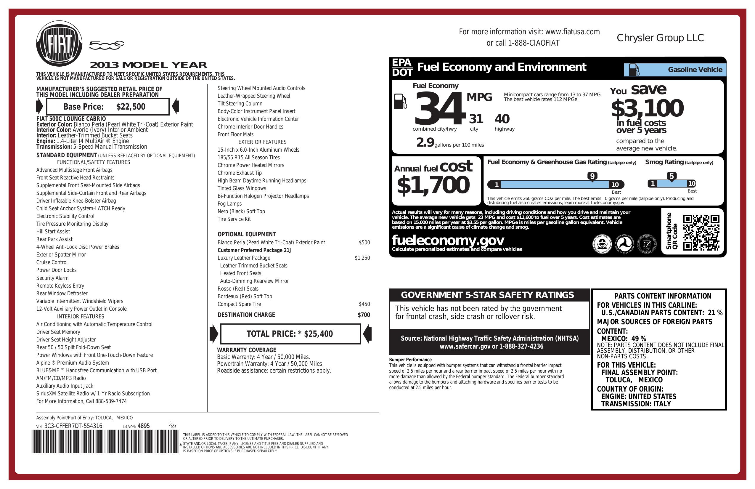 2013 Fiat 500 2dr Conv Lounge
