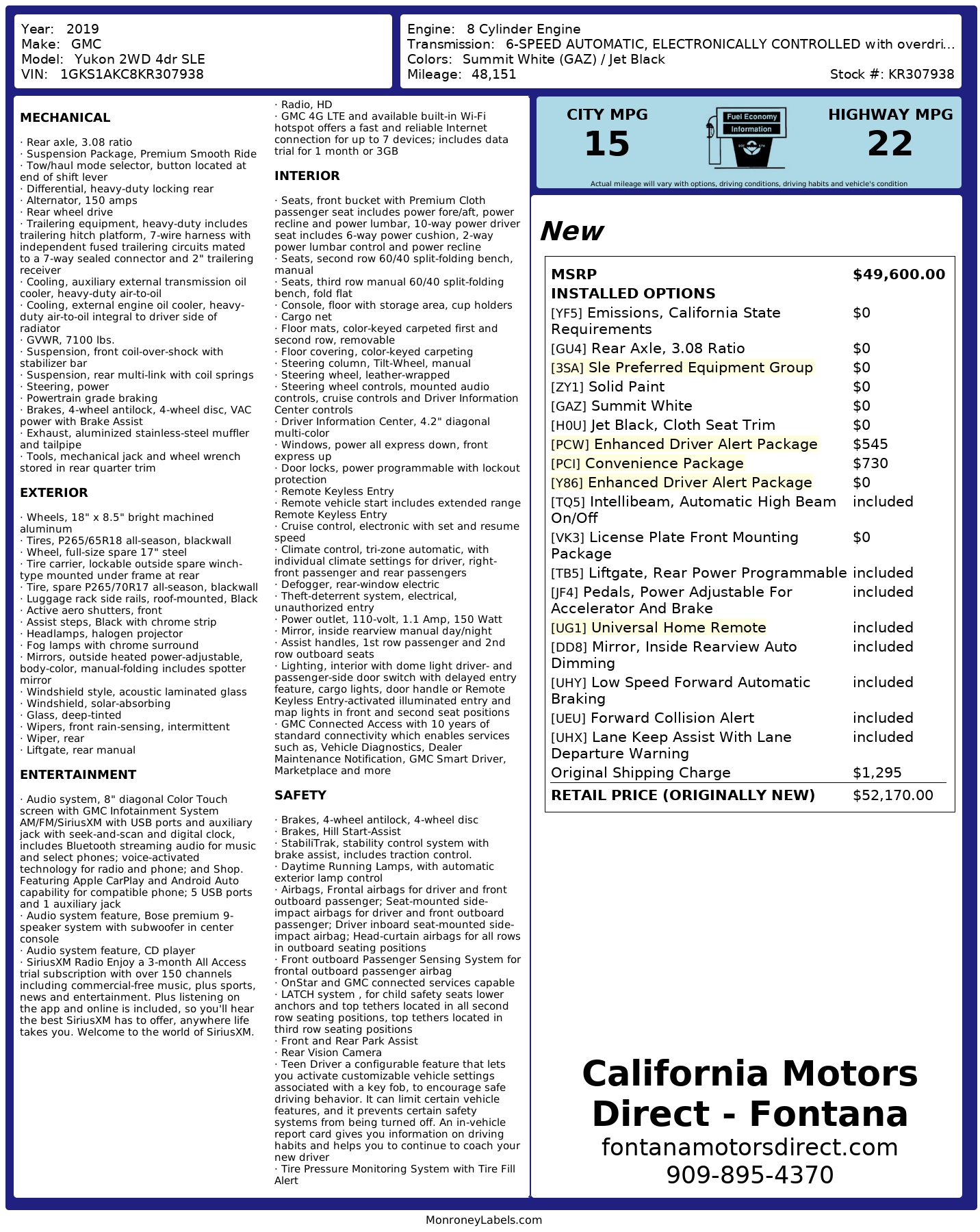 2019 GMC Yukon 2 Wd 4dr Sle