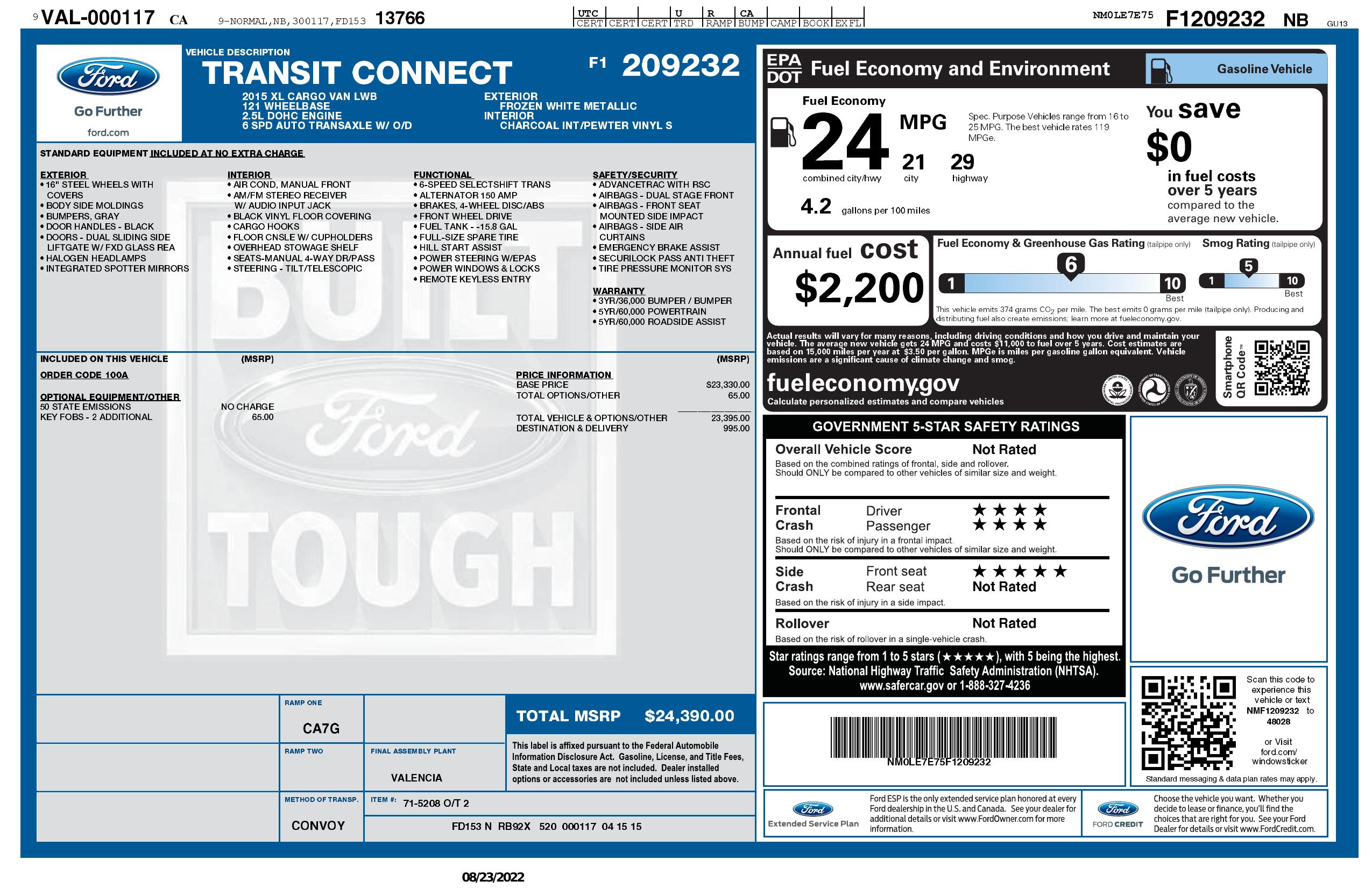 2015 Ford Transit Connect Lwb Xl W/Rear Liftgate