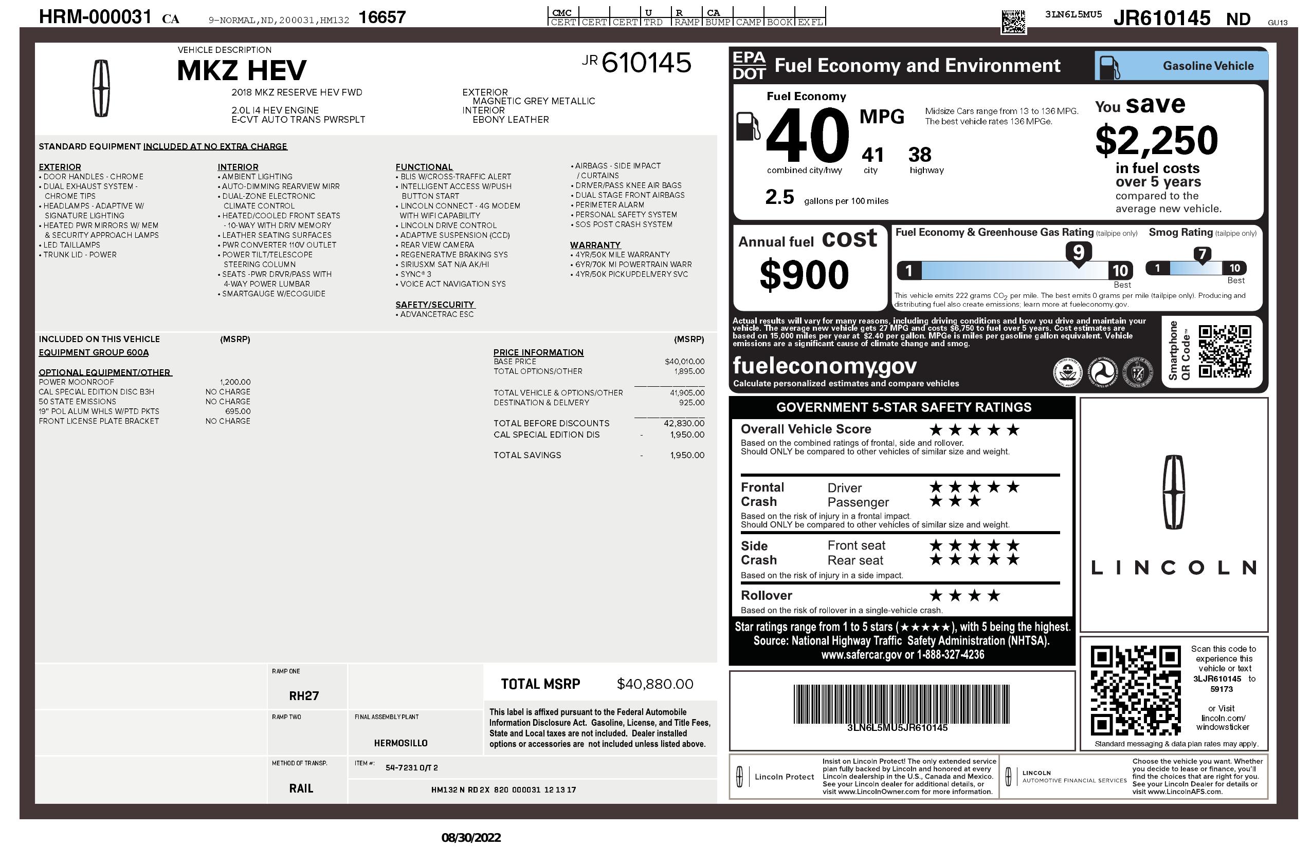 2018 Lincoln Mkz Hybrid Reserve Fwd