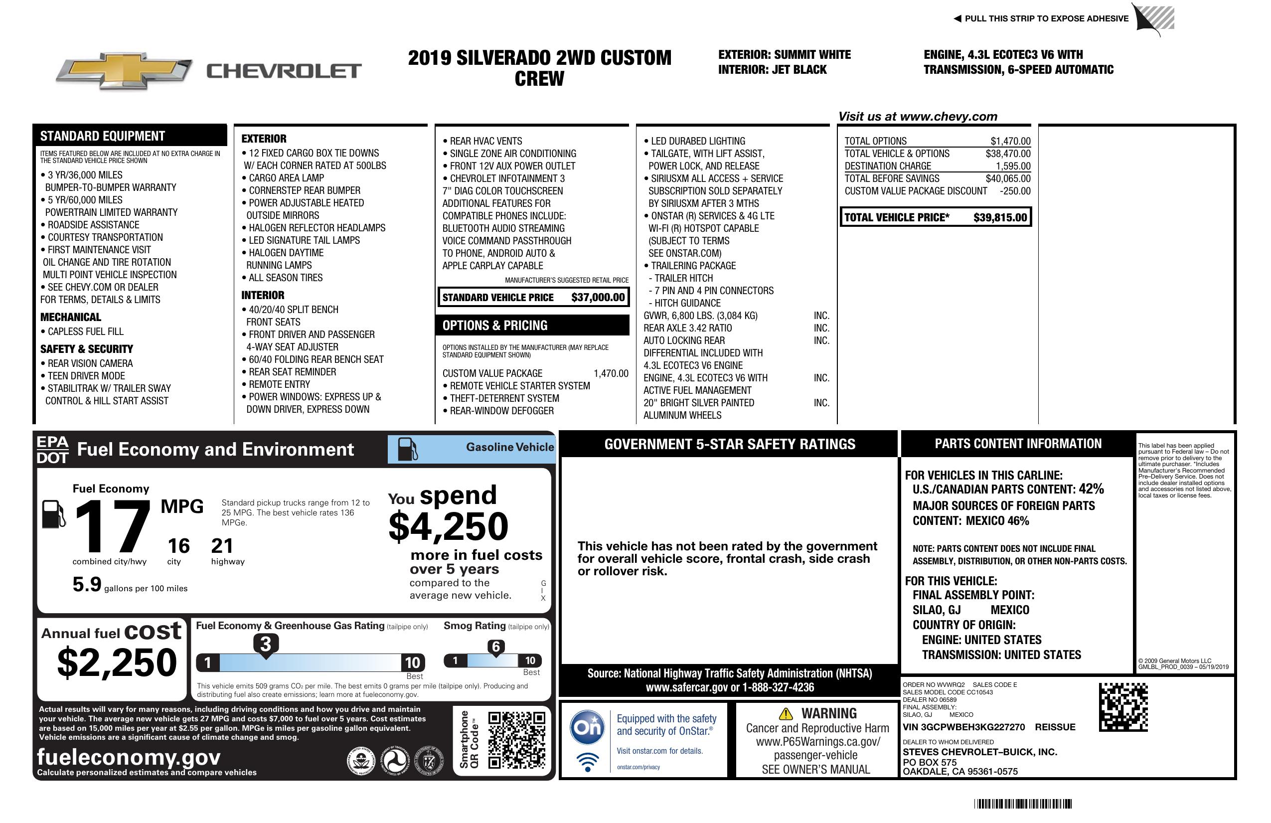 2019 Chevrolet Silverado 1500 2 Wd Crew Cab 147" Custom