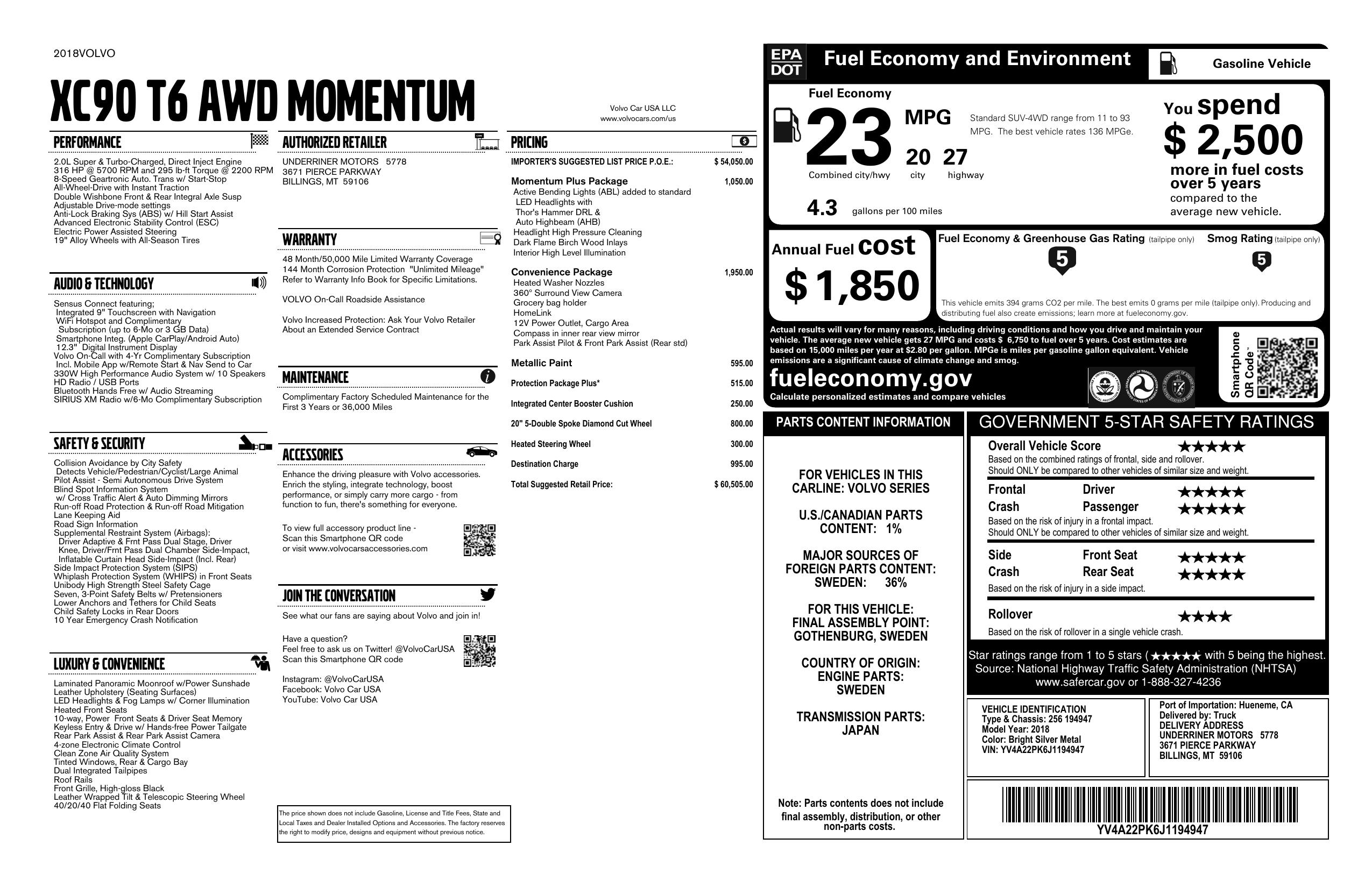 2018 Volvo Xc90 T6 Awd 7 Passenger Momentum
