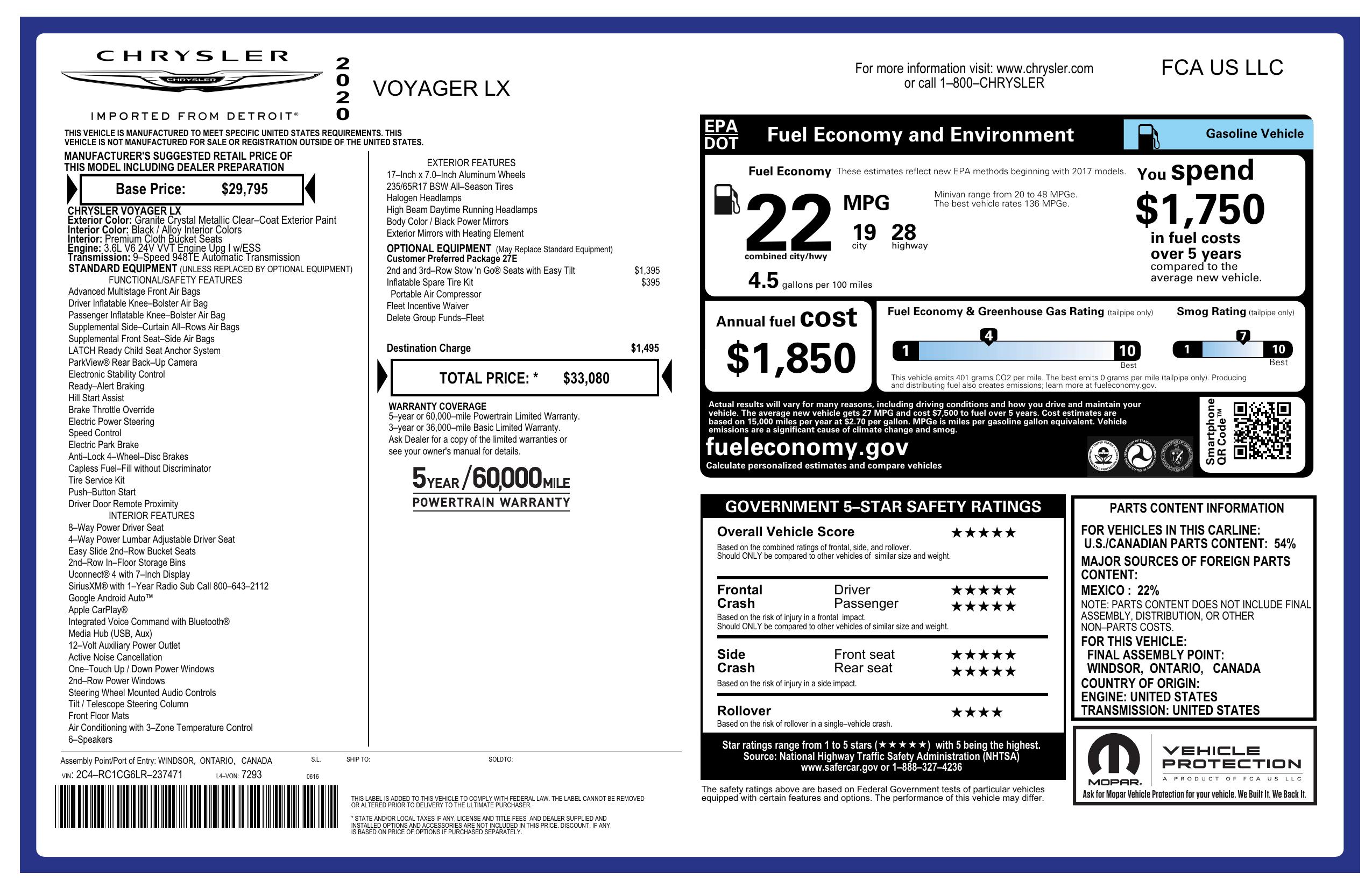 2020 Chrysler Voyager Lx Fwd