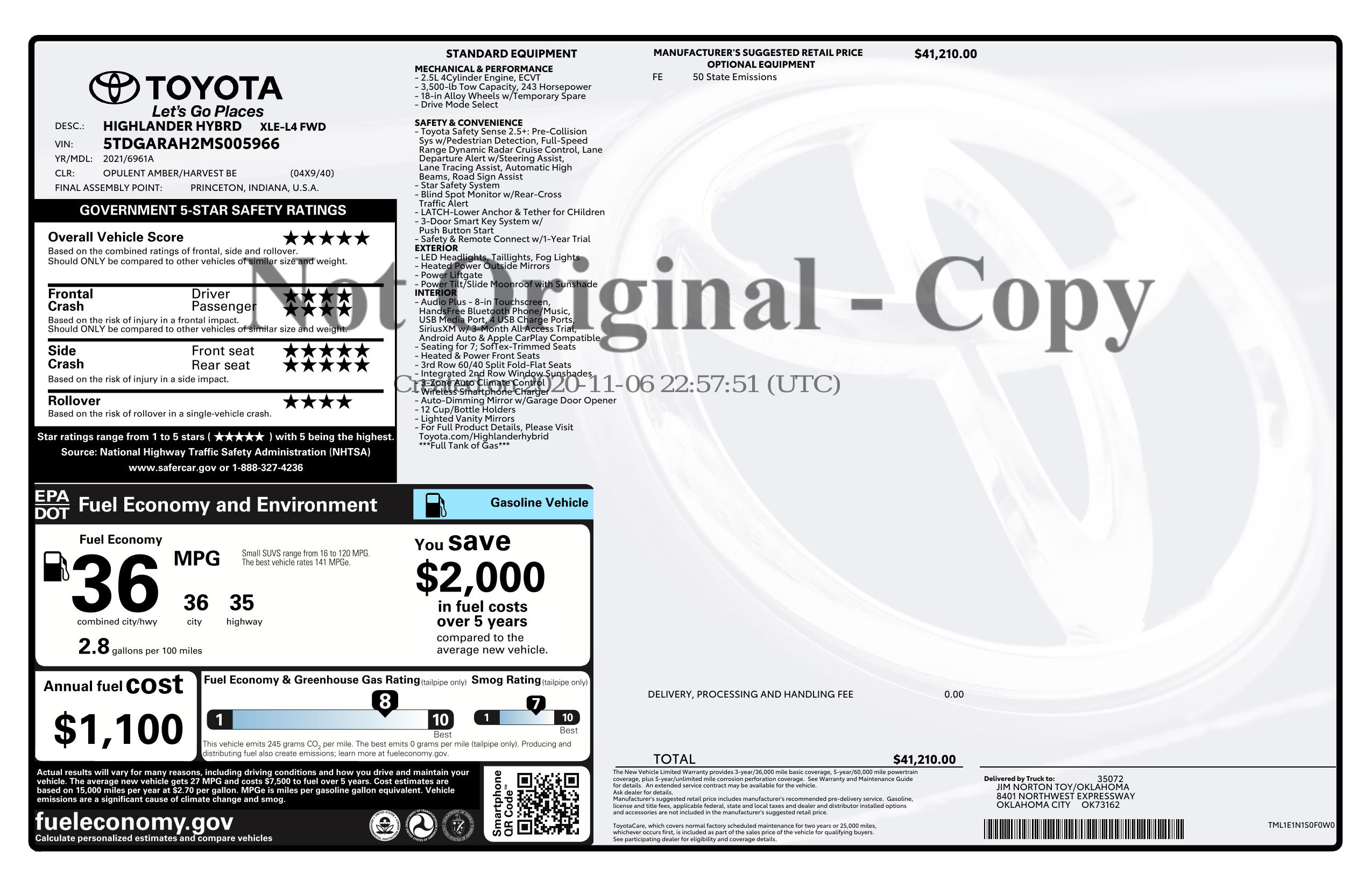 2021 Toyota Highlander Hybrid Xle Fwd (Natl)