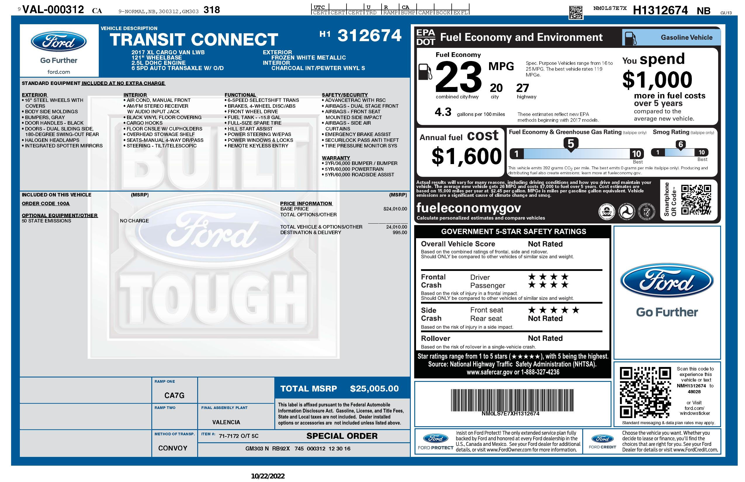 2017 Ford Transit Connect Van Xl Lwb W/Rear Symmetrical Doors