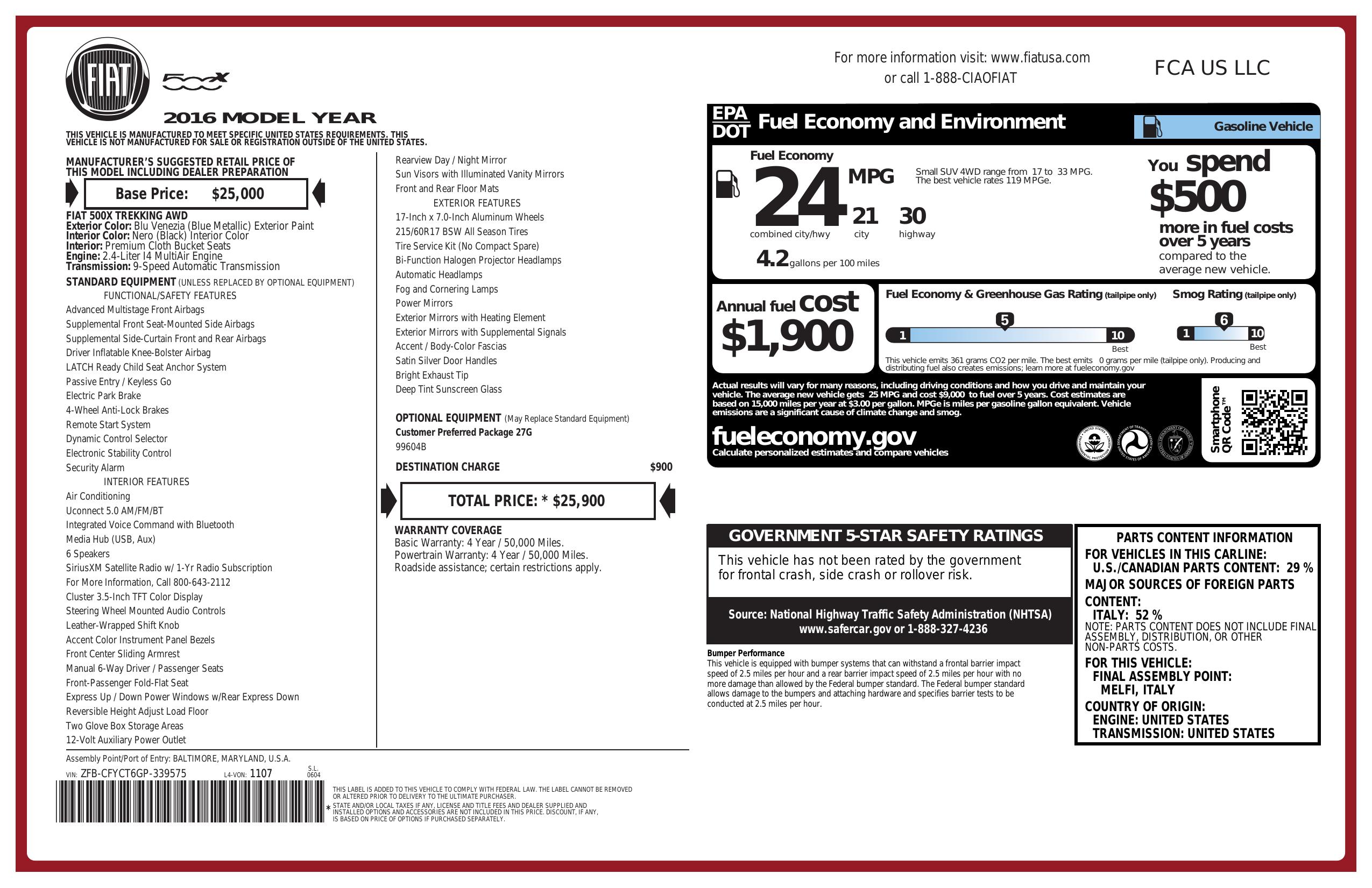 2016 Fiat 500 X Awd 4dr Trekking