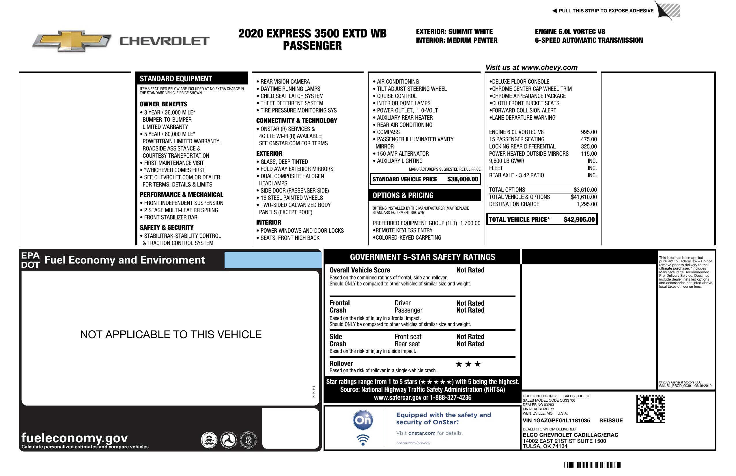 2020 Chevrolet Express Passenger Rwd 3500 155" Lt