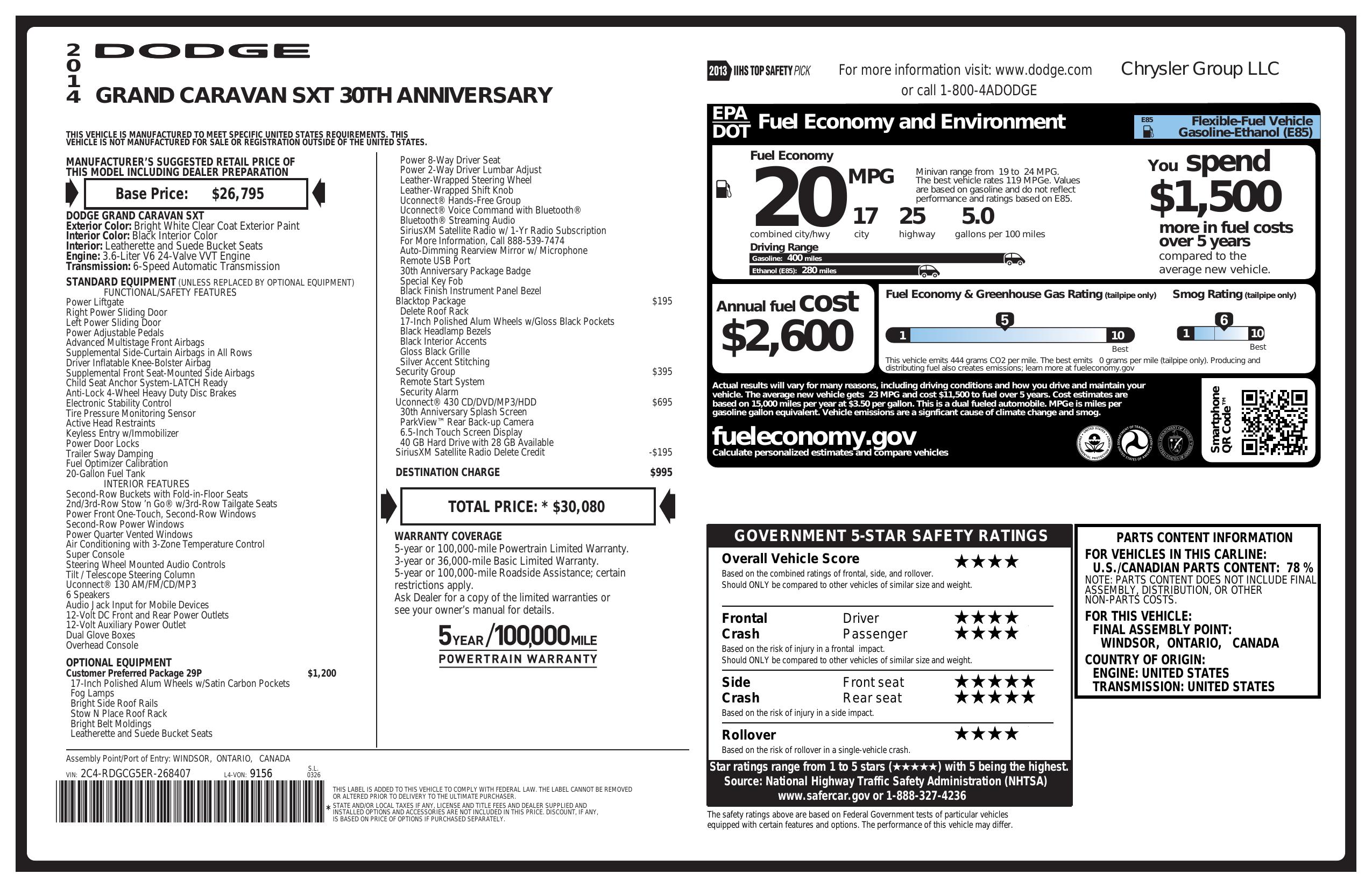 2014 Dodge Grand Caravan 4dr Wgn Sxt 30th Anniversary