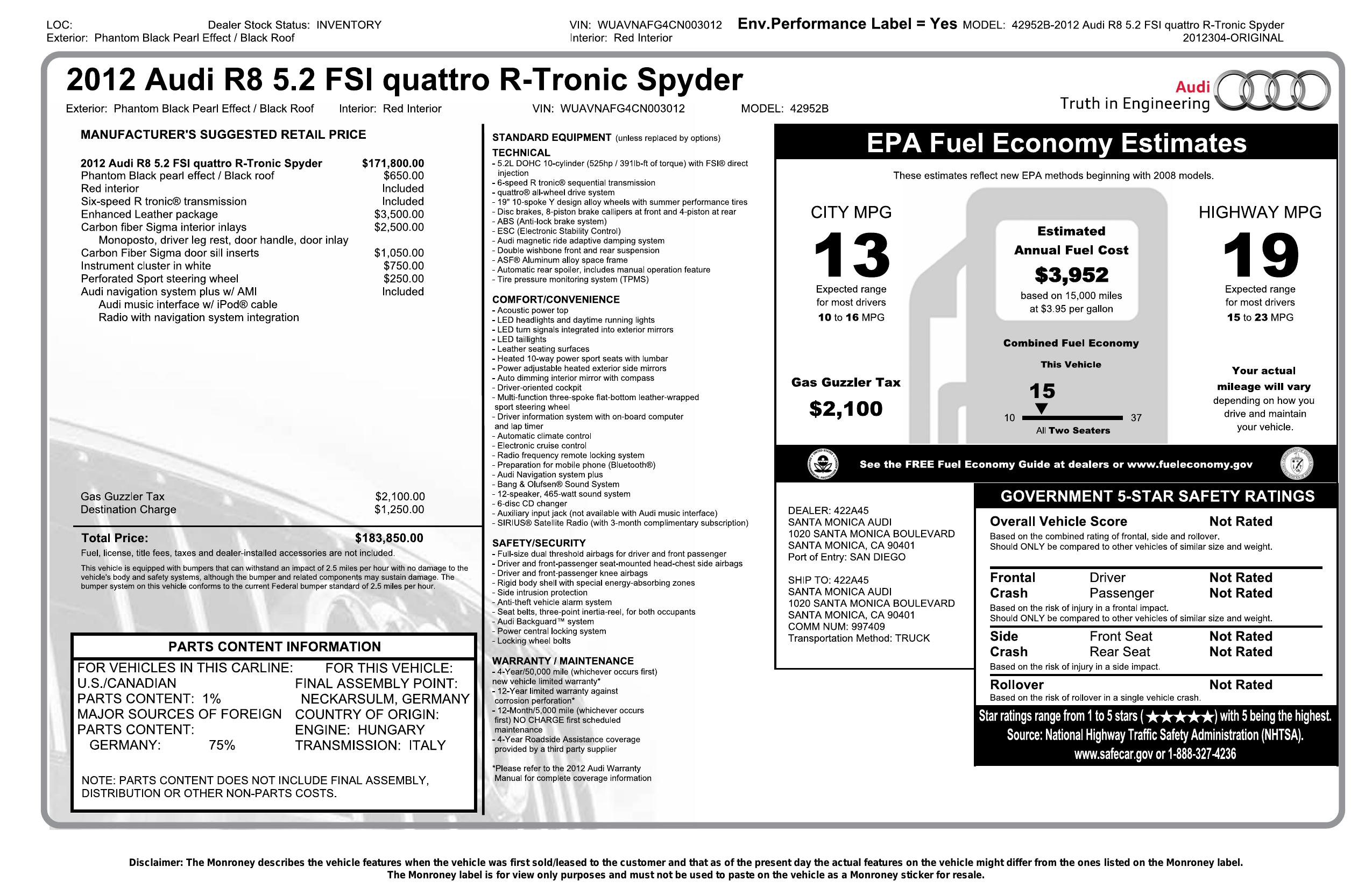 2012 Audi R8 2dr Conv Auto Quattro Spyder 5.2 L