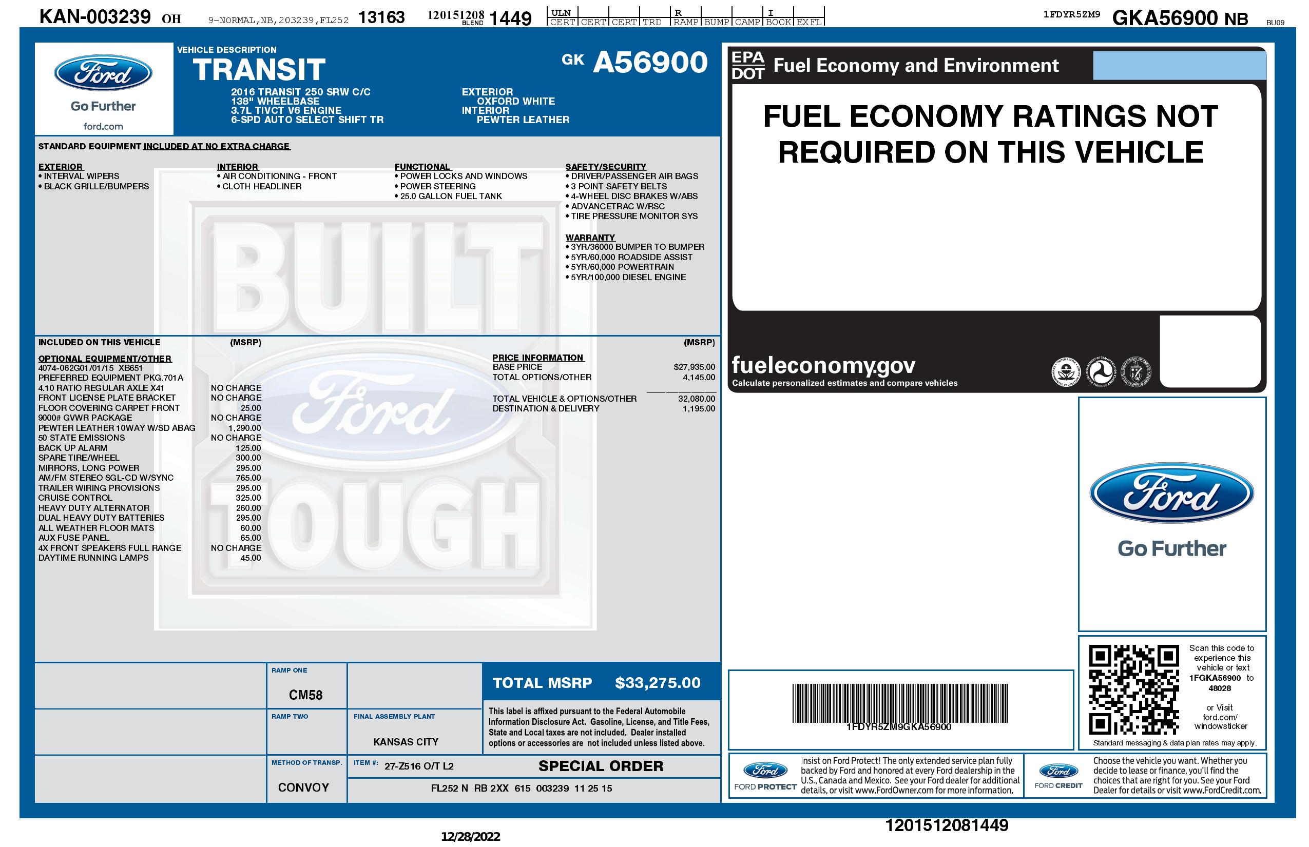 2016 Ford Transit Chassis Cab T 250 138" 9000 Gvwr Srw