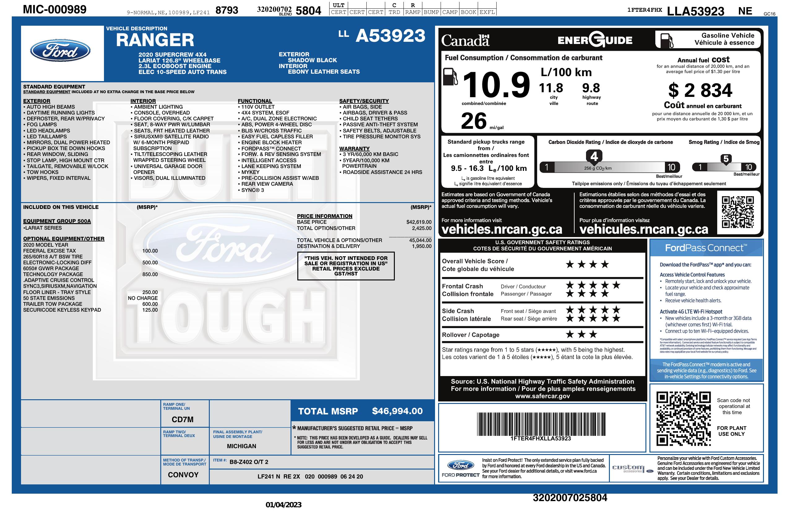 2020 Ford Ranger 4 Wd Super Crew 5' Box