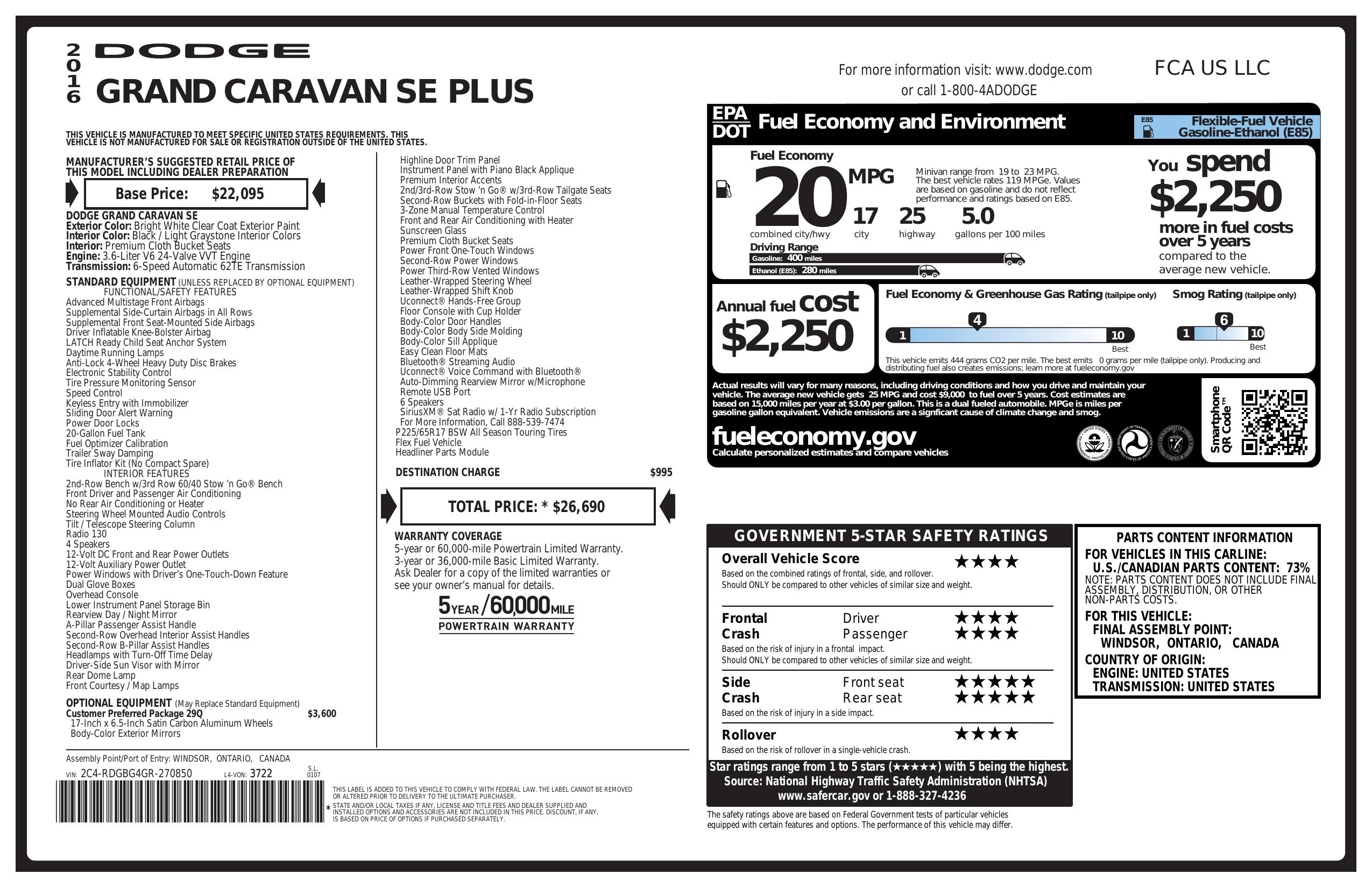 2016 Dodge Grand Caravan 4dr Wgn Se Plus