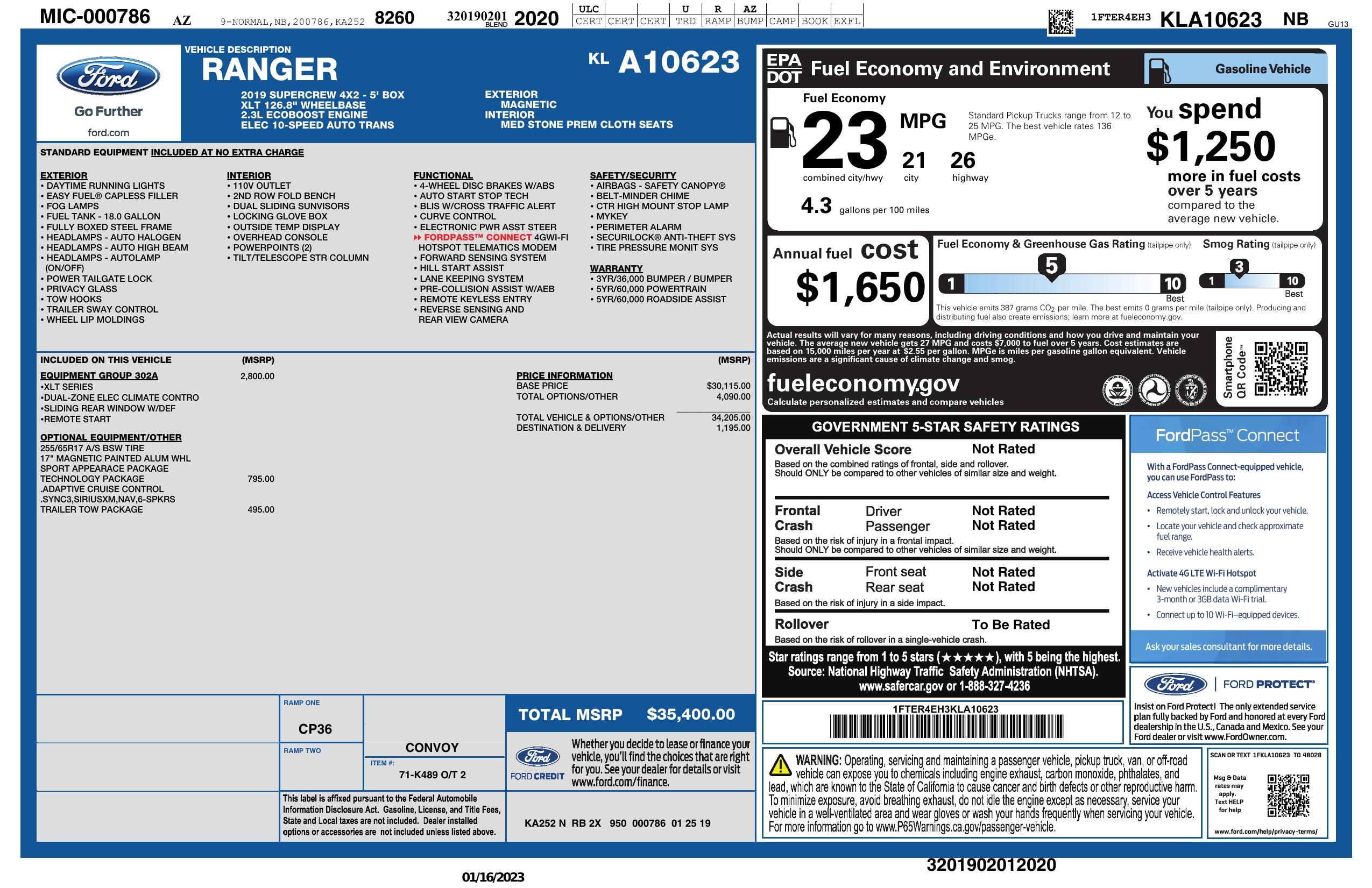 2019 Ford Ranger Xlt 2 Wd Super Crew 5' Box