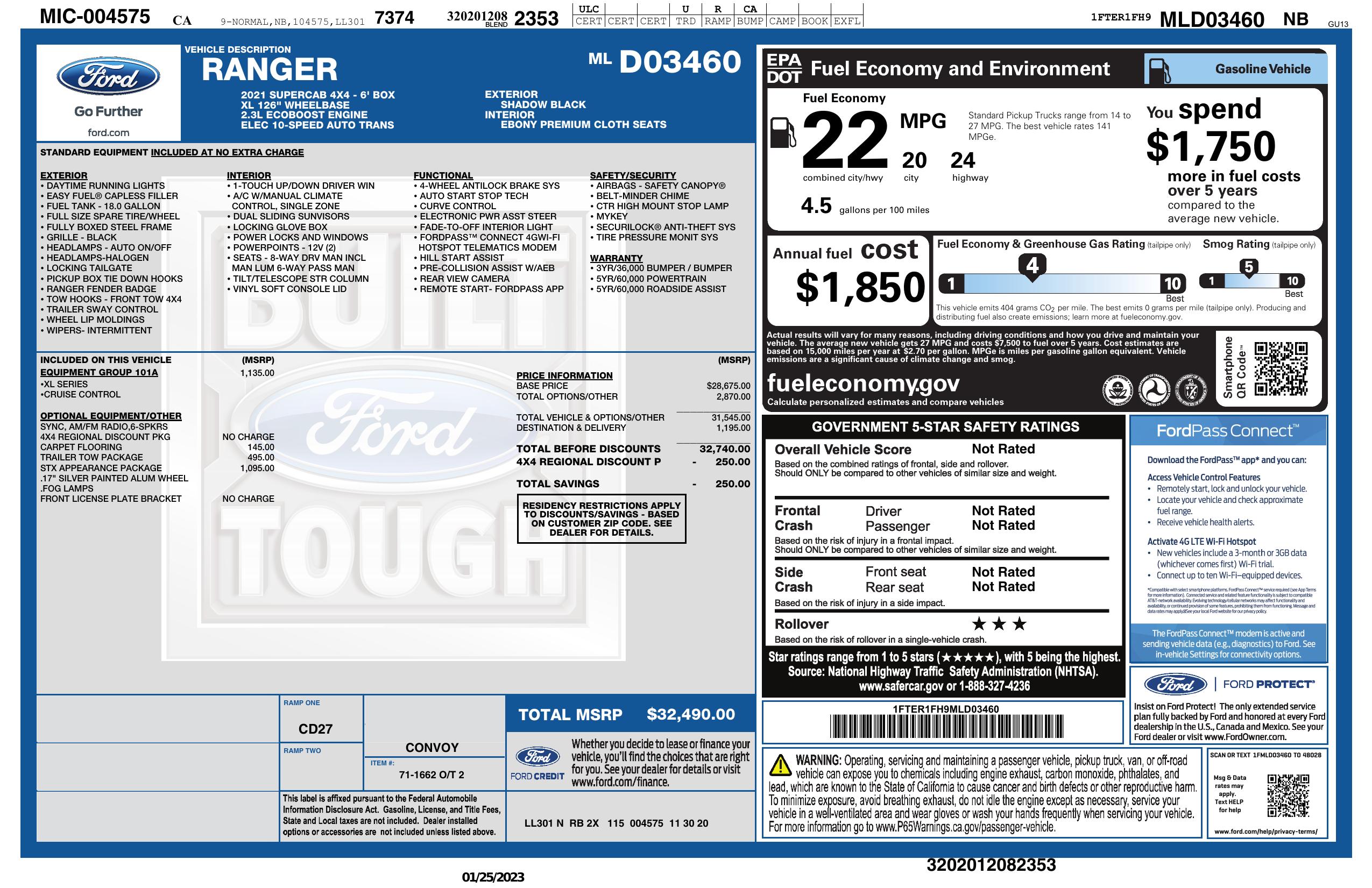 2021 Ford Ranger Xl 4 Wd Super Cab 6' Box